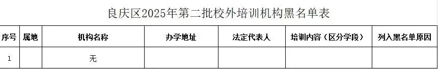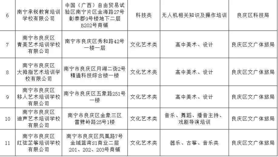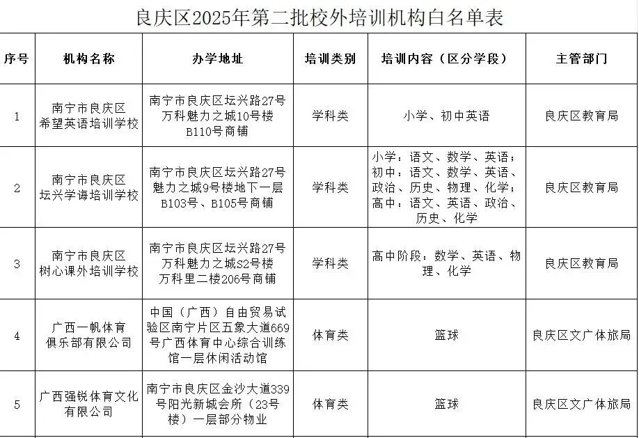 为规范校外培训秩序,根据工作部署,现公布《南宁市良庆区2025年第二批校外培训机构黑白名单表》。