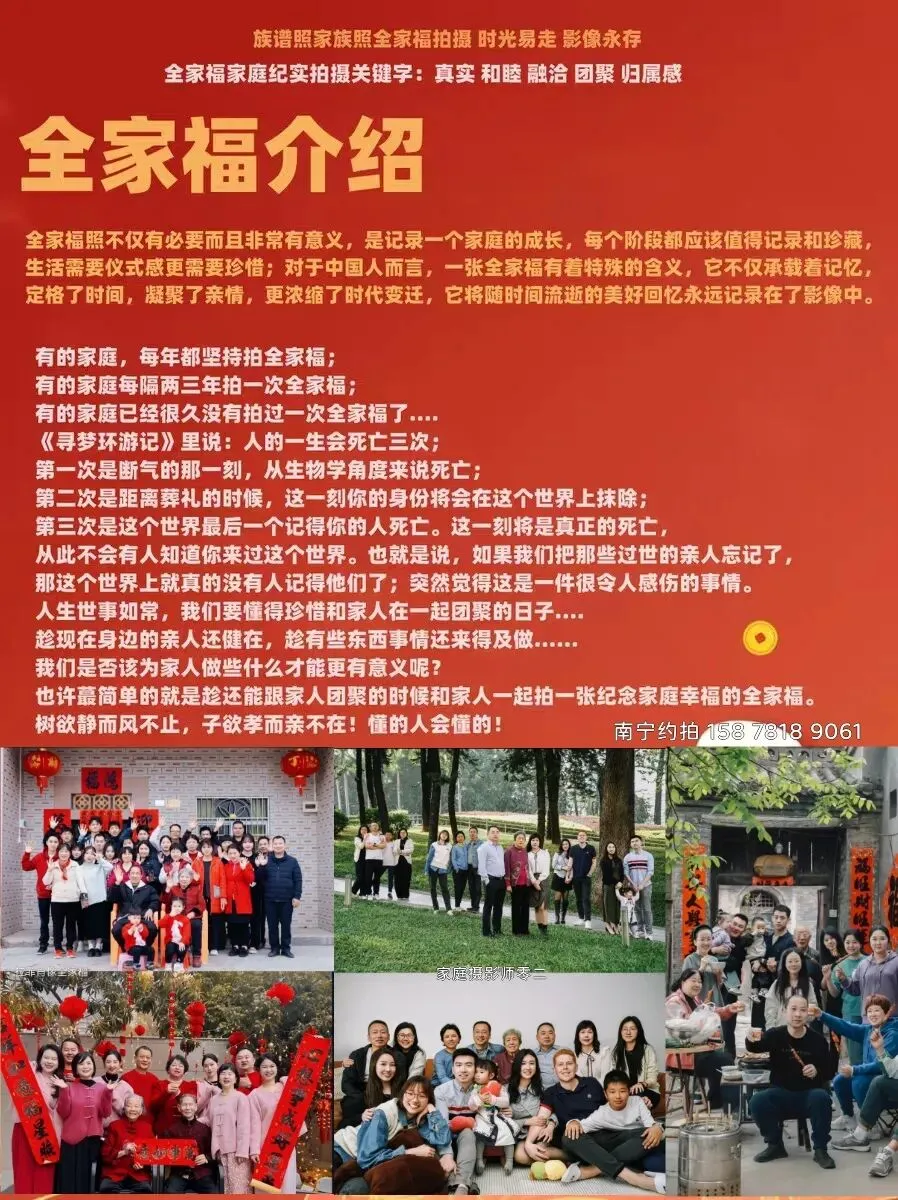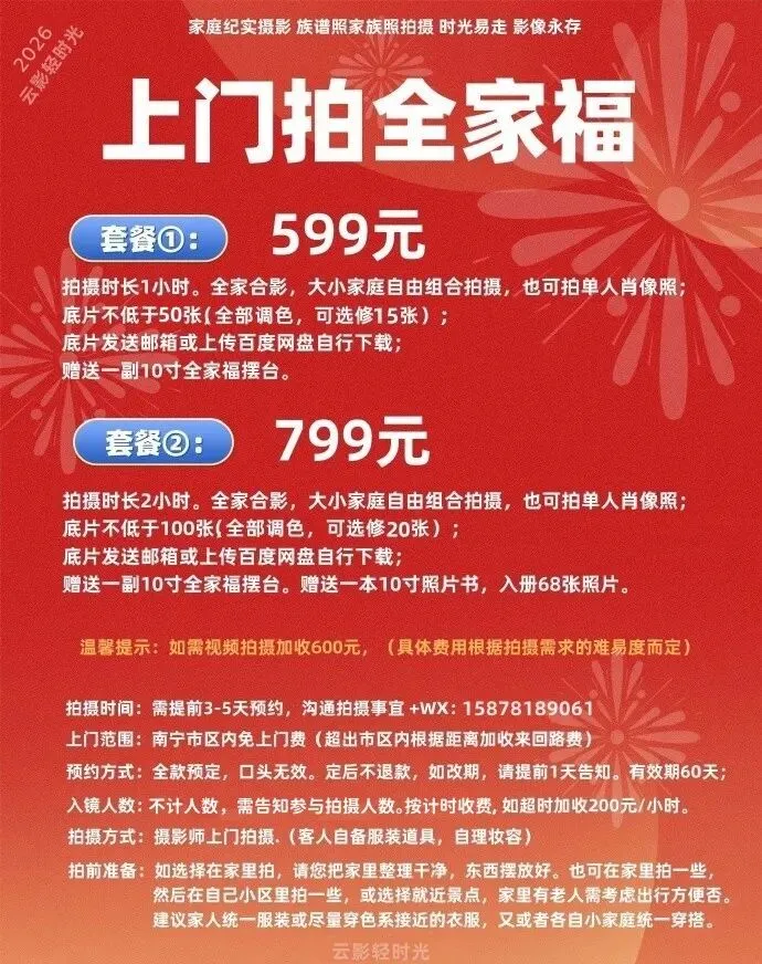 人民日报说:“能拍就拍,能照就照,十年后再好的相机,也拍不出如今的模样”。我很认同这句话。最近很深刻的感受到关于记录的意义。尤其是影像形式的拍摄和记录,在定格捕捉当时的光影,情绪和故事后,即使光阴流转,空间变幻,但神奇的是,竟仍能清晰的感知到彼此时间定格背后,一种关于“在场”的表达。在拍了多个家庭的全家福之后,我想我能理解为什么有的家庭喜欢拍全家福?全家福:全家人的合影是一个家庭团聚的纪念,是一个组织团结筑梦的表现,是每一个家庭成员发自内心对家团结和谐的凝聚力。一张全家福,像族谱一样记载家庭、企业、组织的成员变化和重要时刻,传递出不同家庭的情感和梦想。全家福意味着什么?每个人都希望有一个温馨的家庭。全家福记录了一个家庭的所有成员影像,一张全家福就定格了家庭成员的永恒大团圆,以及很多随着时间流逝不可挽回的美好回忆。全家福的意义非同寻常。一张全家福,照见的是对“团聚”的渴望,更是对“如何更好地相守”的探索。拍摄全家福一定要去影楼拍吗?其实每个家庭的成员人数多少不一样,有的只拍几口之家的全家福,有的是大家庭十几人甚至几十人的大家庭,拍摄全家福或者拍家庭族谱照的时候可以根据各自的需求来选择,影楼拍摄全家福的费用是按人头按套数收费会偏贵一些,尤其是拍摄家庭成员人数多的全家福,在影楼拍摄通常都要大几千甚至上万的费用,并且在影楼的拍摄空间比较受限制拍出的照片比较流水化,有的家庭喜欢影楼的流水线拍摄就选择在影楼拍,然而有的家庭又比较喜欢个性贴切自家生活化的照片所以就不一定在影楼拍摄。因此也有很多家庭请摄影师到自己家里或者在自家楼下的小区里拍全家福。上门拍摄的本质是让所有家人度过一场有陪伴的家庭日。在家里拍摄全家福即便没有高大的装修,也比在影楼布景拍的更有意义,因为这是家,记录的都是家的味道。拍平时的日常,拍摄家人一起时的生活常态,拍摄家庭生活的烟火气,拍摄家人谈笑风生或者一起出游相处的时光,拍摄过程常以纪实摄影为主和适当摆拍的方式相结合。上门拍全家福通常按小时收费 并且不限制拍摄人数,但是需要客人自备服装自己准备好妆容参与拍摄,拍摄时长1小时起拍,不到一小时按一小时。拍摄地点建议在约拍者的家里或者楼下小区里,也有的家庭选择到一些游玩的景点,家人一起出游,让摄影师跟拍。那么在南宁请一位摄影师上门拍全家福的收费是多少呢,下面是小云影平时拍摄全家福的价格供大家参考。如果家人很难抽时间一起参与拍摄,选什么日子拍摄全家福好呢?通常选择新春假期间或者选择某些重要意义的纪念日和节日,生日宴、乔迁新居等,一些特殊的日子,把家庭成员都集聚到一起,然后请摄影师上门拍摄即可。家人难得聚一起,趁这个时候多拍几张全家福照,多年以后,你会觉得这张照片是多么的弥足珍贵。时光易走,影像永存。2026,祝福大家