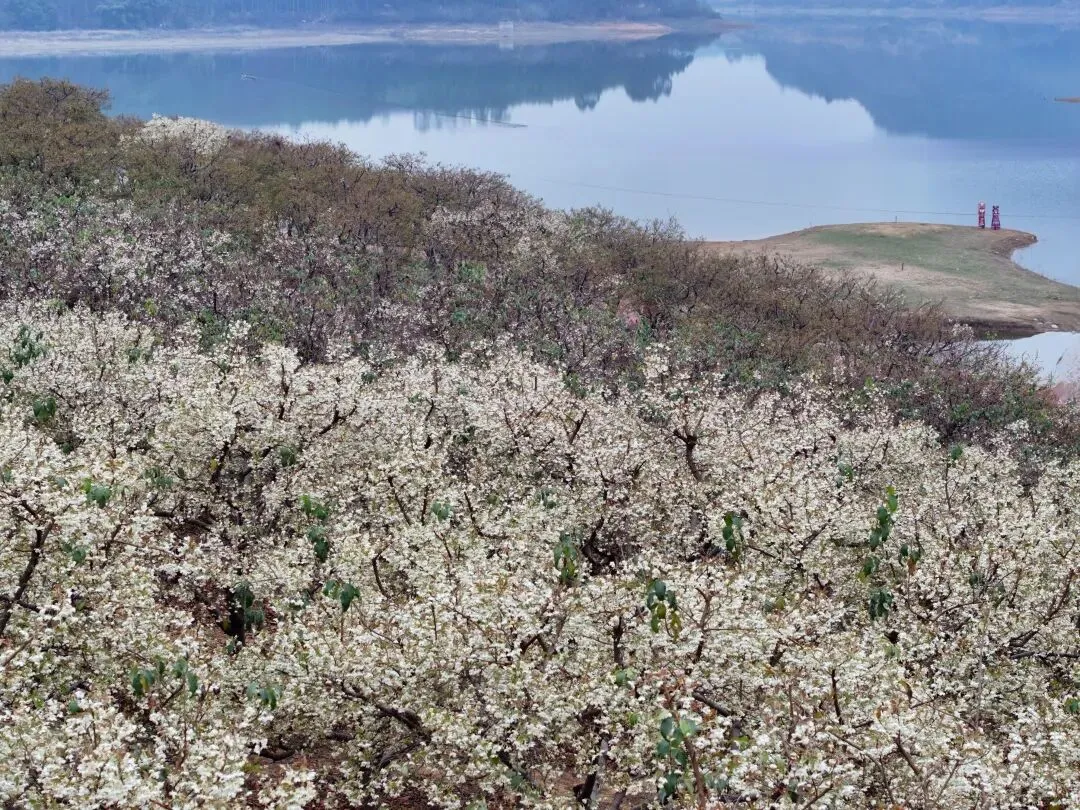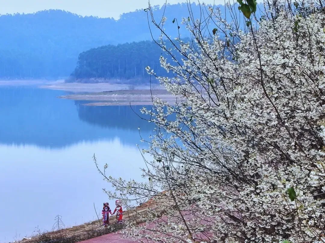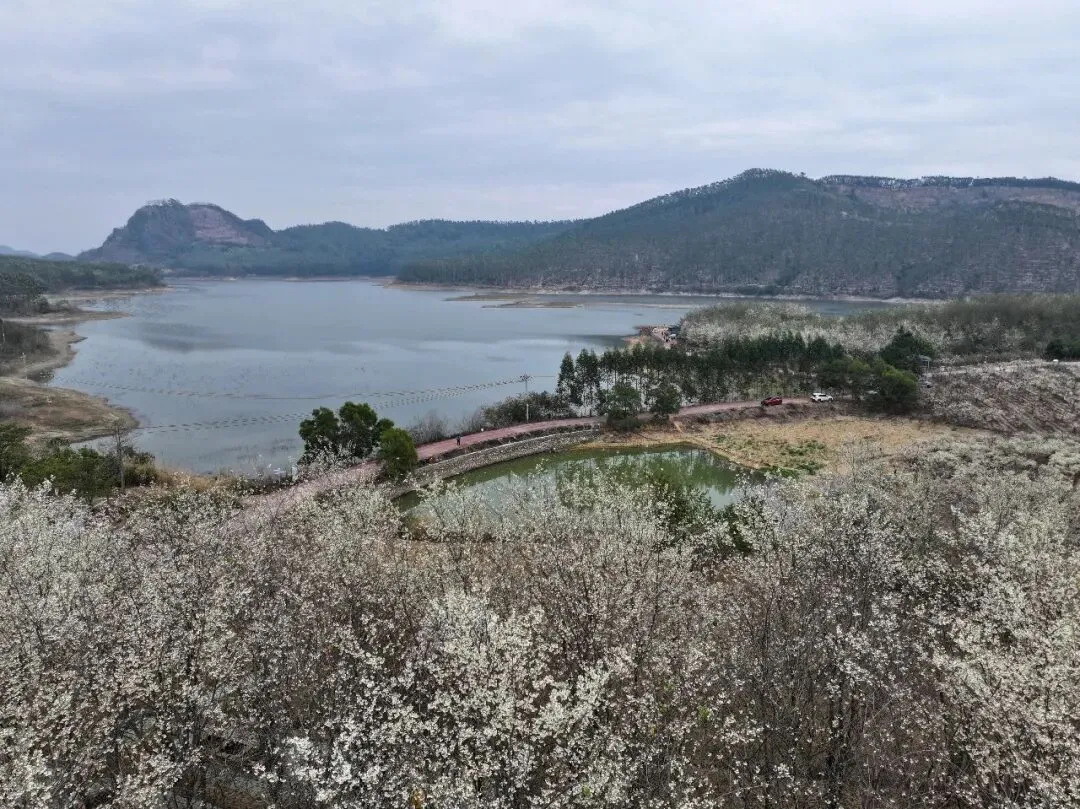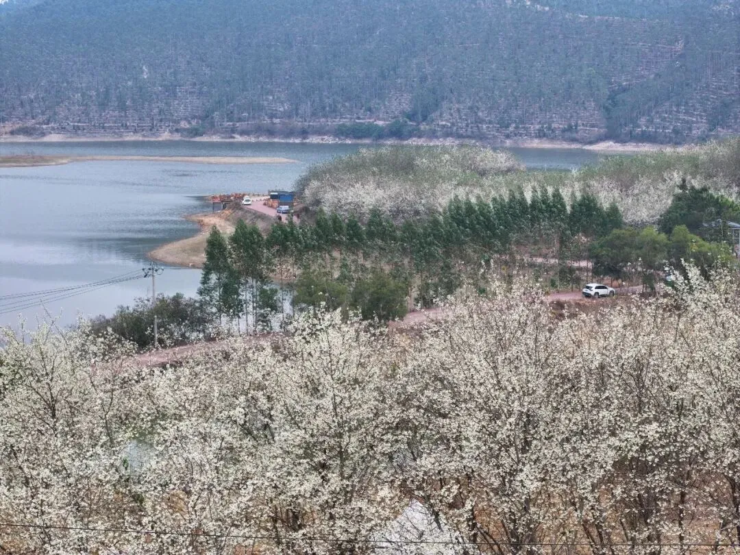 龙母水库的碧波倒映着花海,远山如黛,近花如雪,游人穿梭其间,成了画中最生动的笔触。