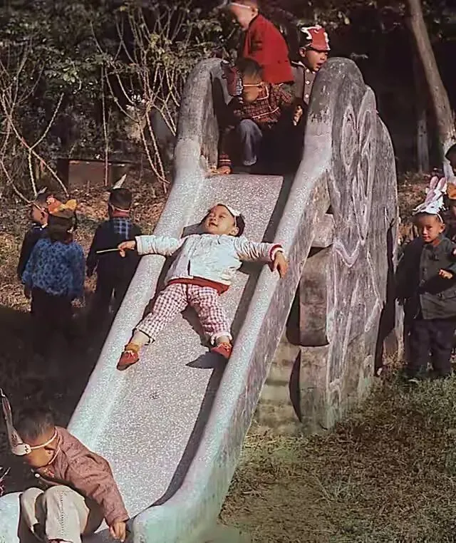 南宁蒲津的儿童在水泥大象滑滑梯上玩耍