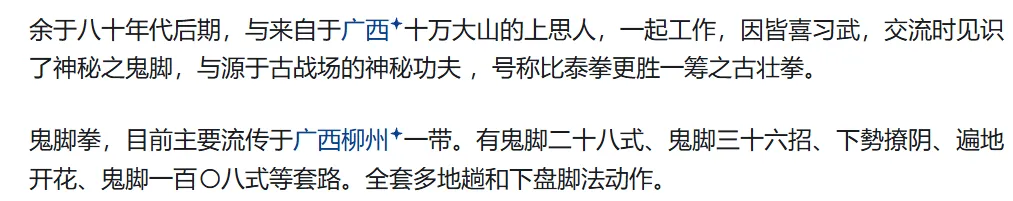 柳州肖广礼先生演练的“下势撩阴”整理出的“鬼脚门”拳谱中一段仅从这里就能看出,“鬼脚门”招式极其多变,尤其是以丰富多变的下盘脚法见长,仅仅脚法就有:格脚、蹬脚、勾脚、剪脚、缠脚、扫脚、撩脚、摆脚、穿脚、踏脚、鸳鸯脚等等。但也有一种说法认为,“鬼脚”起源于北方的“鸳鸯腿”“戳脚”等,其相似之处也非常多。据说,习得“鬼脚”后,有“拳打六路,脚踢八方”之妙。但真正的武功,不是几个套路这么简单,以前我也讲过,真正的入室弟子,还要学习相关的功法、心法,有时候还有本门特有的秘药等等,还要加上本门的信物、口令等等,这才能真正展示出武林全部的魅力。武林的神秘,来自几千年的文化积淀,它有没有用不重要,重要的是它代表着我们的过去,以及未来的可能性。熊欣欣和“鬼脚七”到底是巧合还是真有渊源,这个只能去问他自己了。毕竟从柳州的武林走出来,熊欣欣也不可能不知道鬼脚门的存在。当然,佛山一带也确实有“鬼脚”的传承,但和柳州是不是一个“鬼脚”,我也无从知晓。不过值得一提的是,熊欣欣对于柳州武林来说,是绝对的大恩人。90年中期,柳州武协成立要一笔几万块的注册费,当时才刚刚成名的熊欣欣自己也不宽裕,但接到求助后一口气就捐了几万元,这才使柳州武协能够顺利成立。此后,熊欣欣多次捐款,为柳州的武术事业帮了很多忙。总之,无论是巧合还是真的学习了“鬼脚”,都希望熊欣欣这些柳州儿女能够在外兴旺发达,把柳州的故事讲到更远的地方!献给每位柳州人的睡前故事