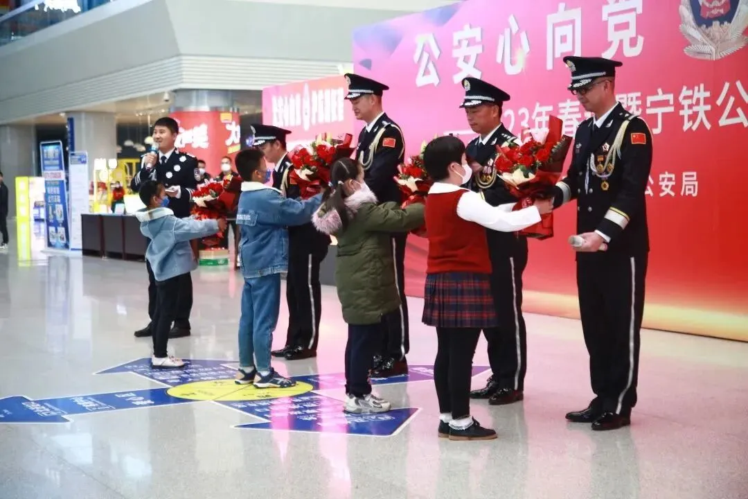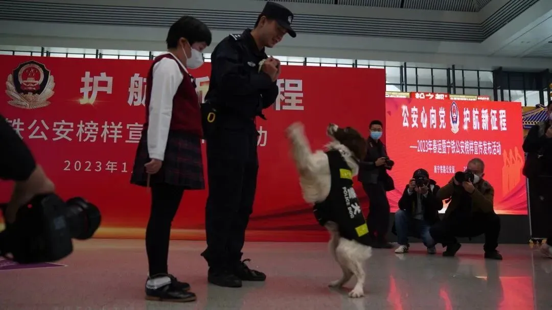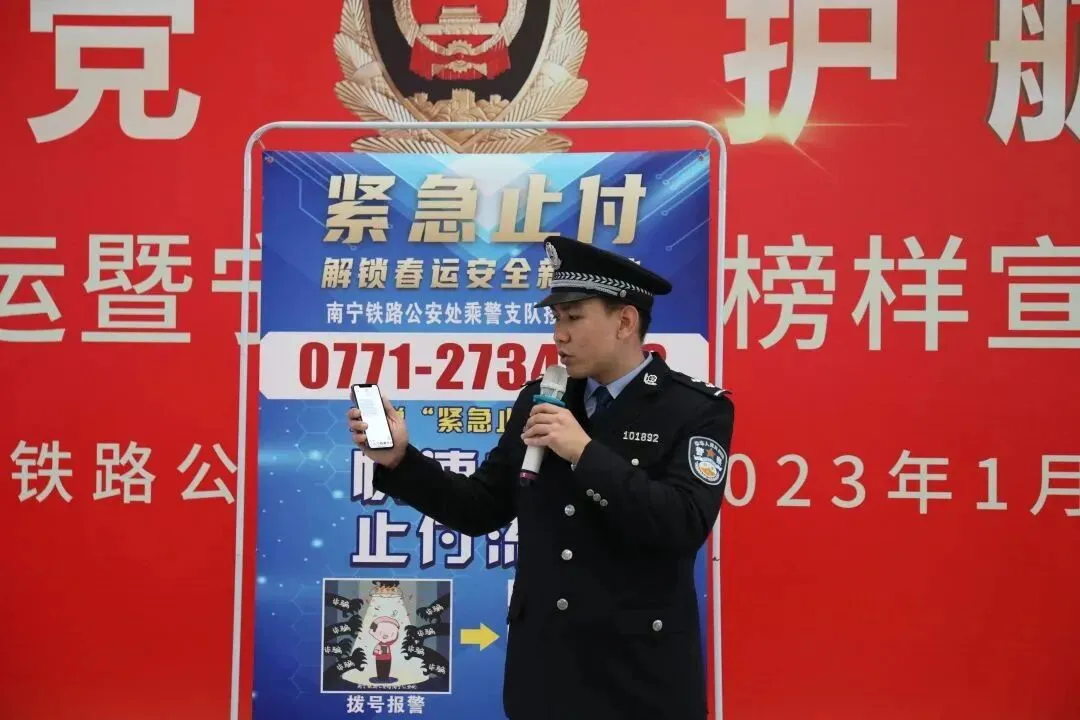 1月6日,春运即将来临,南宁铁路公安局在南宁东站开展“公安心向党、护航新征程”2023年春运暨宁铁公安榜样宣传发布活动。活动当天,南宁铁路警方以宣誓保平安、公布“一键报警止付”功能、返还涉案资金、榜样集体亮相、漫画话安全、魔术展形象等多种多样的形式,讲解防扒、防骗、防盗安全知识,介绍铁路公安备战春运的举措,让旅客在平安春运、温馨春运中有更多的获得感、幸福感、安全感。