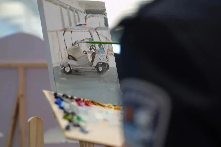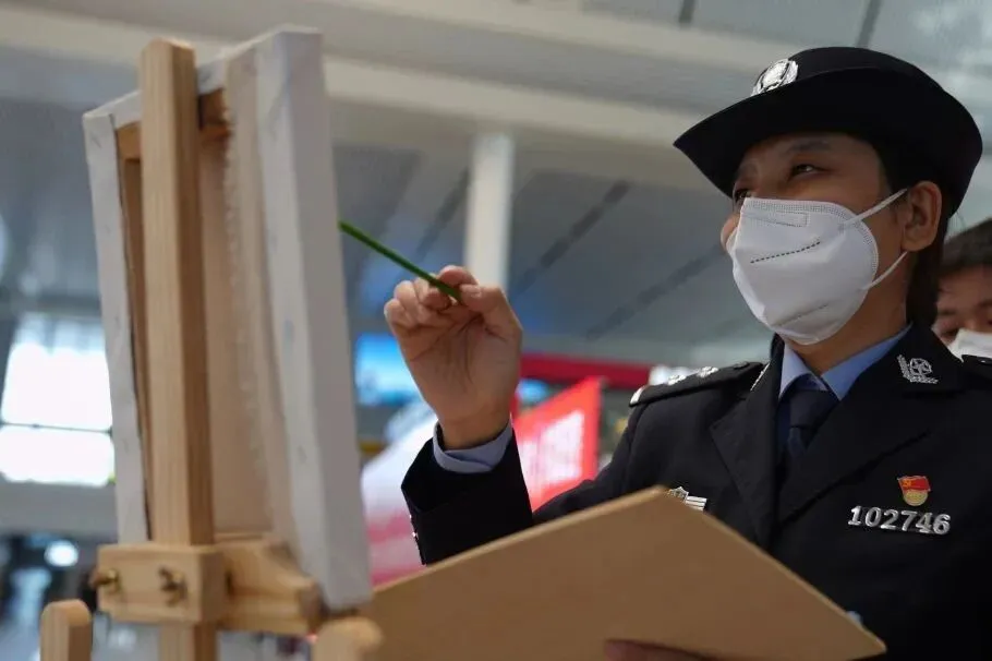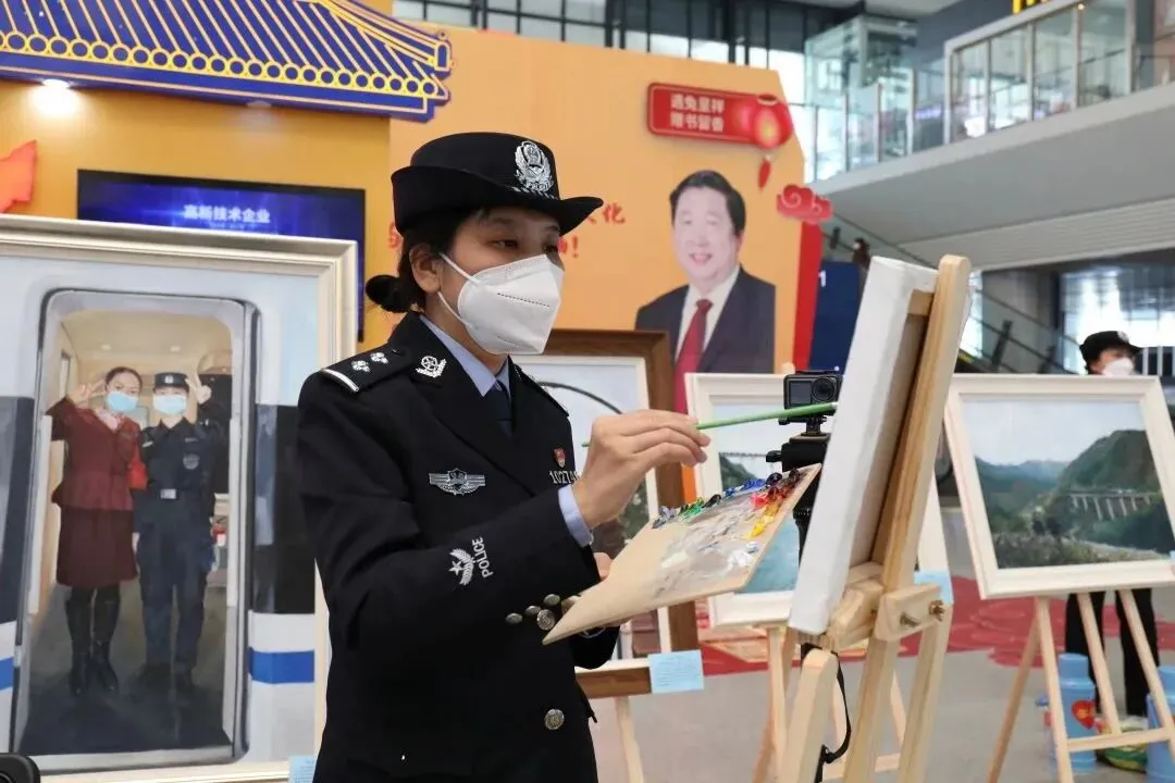 警花亓新周则以铁路、铁警为题材,用油画的方式向旅客展示了铁路公安日常工作场景。惟妙惟肖的人物形象、跃然纸上的真实场景,令在场的观众连连赞叹。这位被同事们称赞的女“画家”,凭借着高水平的画技,屡次在全国公安系统书画比赛中斩获大奖。作品《晨读》在全国第五届“书香三八”读书活动中获书画阅读一等奖。