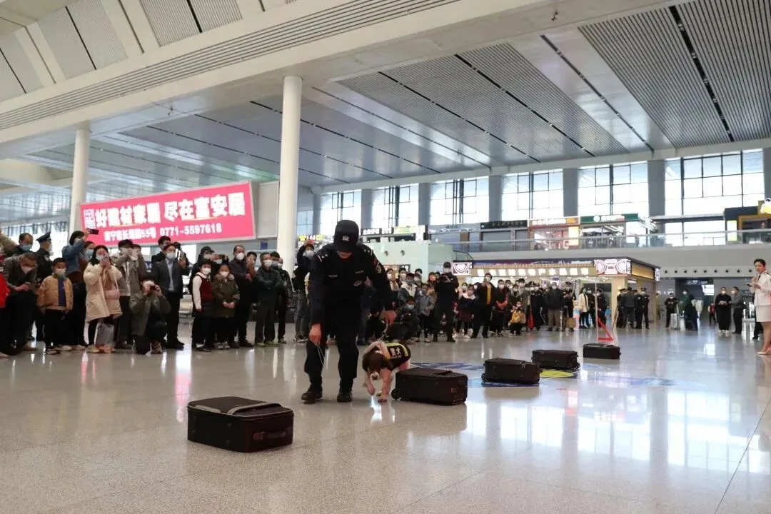 为确保旅客旅途平安,南宁铁路公安局还组织民警携带警犬不间断开展治安巡逻,并围绕警犬服从、治安巡逻、搜毒、搜爆、物证搜索等科目训练,强化警犬查危防爆、搜索违禁品、治安防范、处置突发事件的能力。据了解,2023年春运,南宁铁路警方将在42个车站、投入90余头警犬开展巡逻防控,以确保春运安全。