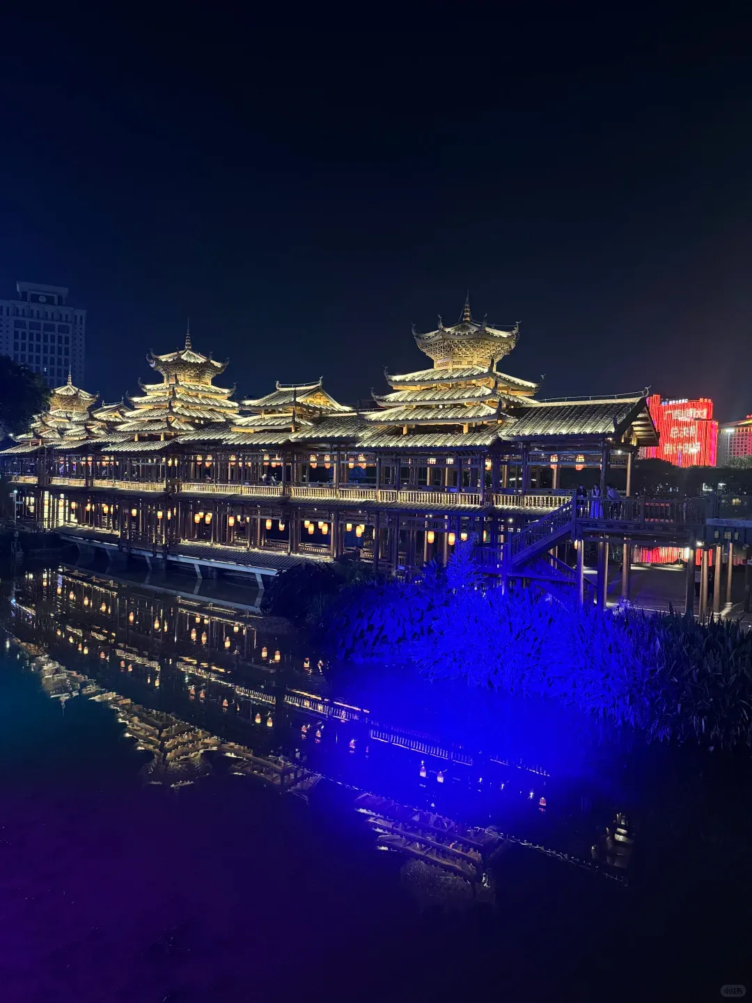 这座小镇有着“小丽江”的既视感,由56栋侗族特色建筑组成,鼓楼、吊脚楼、风雨桥错落分布,采用广西12个世居民族的文字、图腾、纹样进行装饰,处处彰显着浓郁的民族风情。漫步在小镇里,青瓦木楼、流水潺潺,仿佛走进了世外桃源,远离了都市的浮躁。