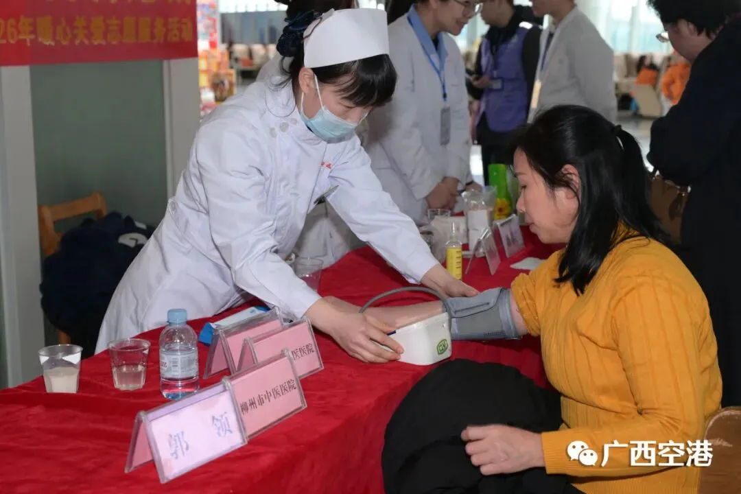 此外,机场还联合柳州市中医医院、广州市妇女儿童医疗中心柳州医院、柳州市妇幼保健院设置了“义诊与健康咨询”服务点,为旅途劳顿的旅客提供舒缓服务,让“安心起航”不仅是一句主题,更成为一段可感知的温暖陪伴。