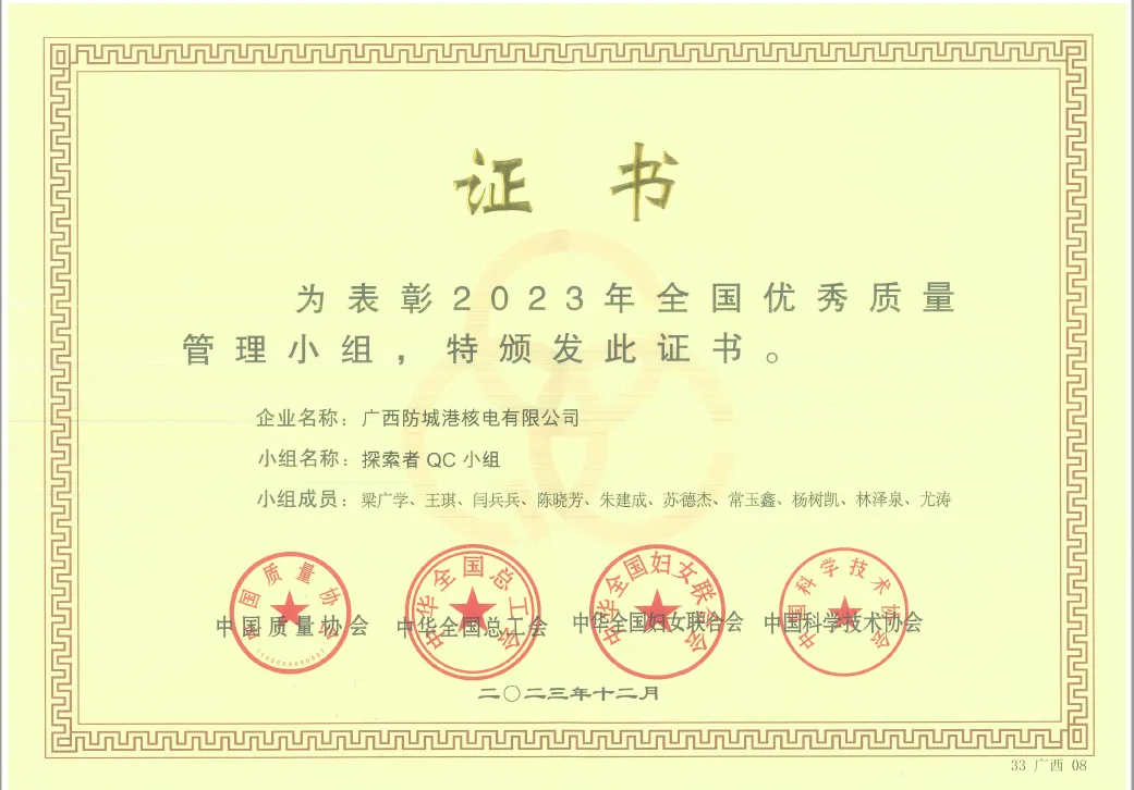 近日,防城港核电“探索者”QC小组荣获2023年全国优秀质量管理小组荣誉称号,成为公司首个获此殊荣的质量管理小组。该奖项由中国质量协会、中华全国总工会、中华全国妇女联合会、中国科学技术协会联合授予,是国内质量管理活动最高荣誉之一。