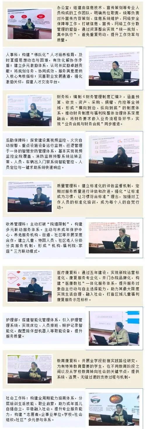 会议第一阶段,各职能科室负责人分别立足于科室本职工作,从年度重点工作计划出发,就如何助力我院高质量发展、提高各部门协同合作水平、拓展专业服务范围、提高服务水平等方面进行了展望。办公室、人事科、财务科、后勤保障科、质量管理科及收养管理科等行政部门主要就院文化建设、制度建设、信息化建设、人才队伍建设等方面提出了发展设想。医疗康复科、护理部、教育康复科、社会工作科等科室就各专业团队的发展,结合我院高质量发展需求,阐述了专业发展思路。