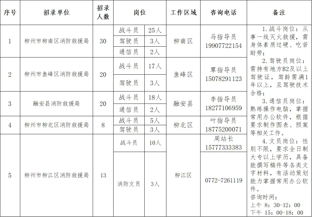 政府专职消防员91人。岗位要求:男性,身高165CM以上,双眼裸视力4.8以上,需具备高中(中专)以上学历,年龄为18-28周岁以下(有部队服役经历或者全日制大专及以上学历可放宽至30周岁),身体素质过硬、吃苦耐劳、心理健康,无遗传性、传染性和慢性疾病,符合体检标准。