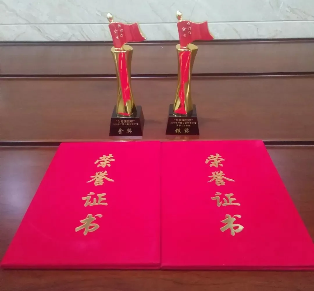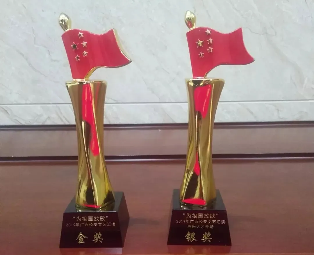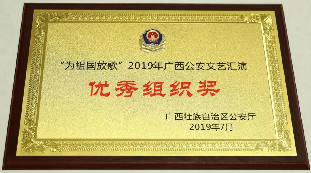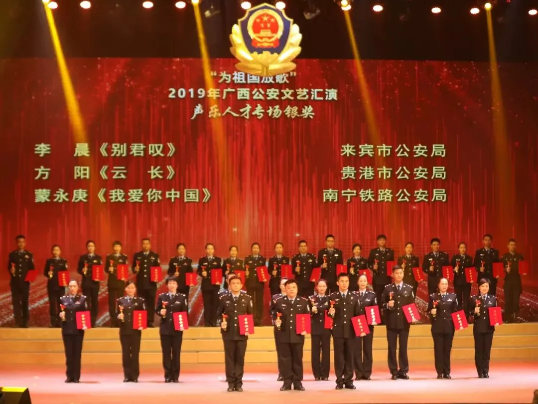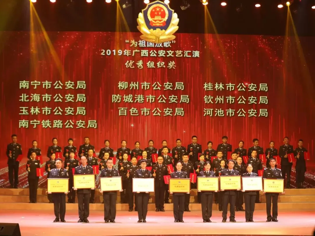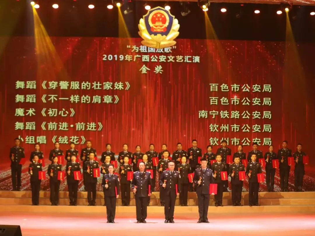 为深入学习贯彻习近平新时代中国特色社会主义思想和全国公安工作会议精神,热烈庆祝新中国成立70周年,结合公安部2019年全国公安系统文艺汇演和广西第二届警察文化季活动,2019年5月起,广西壮族自治区公安厅在全区开展了“为祖国放歌”2019年广西公安文艺汇演,并由专家评委对汇演节目打分、评定,分别评选出金、银、铜奖和特别贡献奖、优秀组织奖。