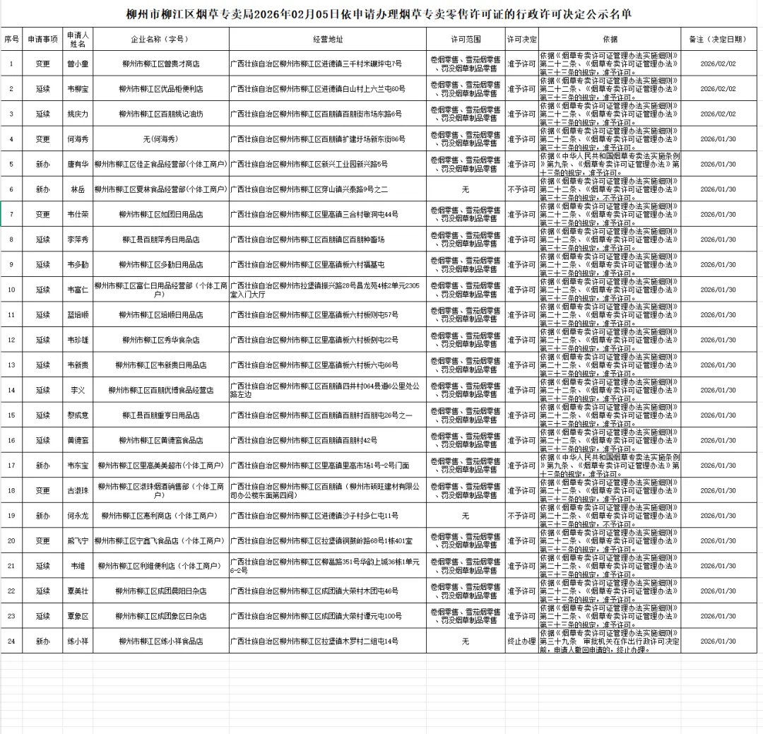 >柳州市柳江区烟草专卖局2026年2月5日依申请办理烟草专卖零售许可证行政许可决定公示