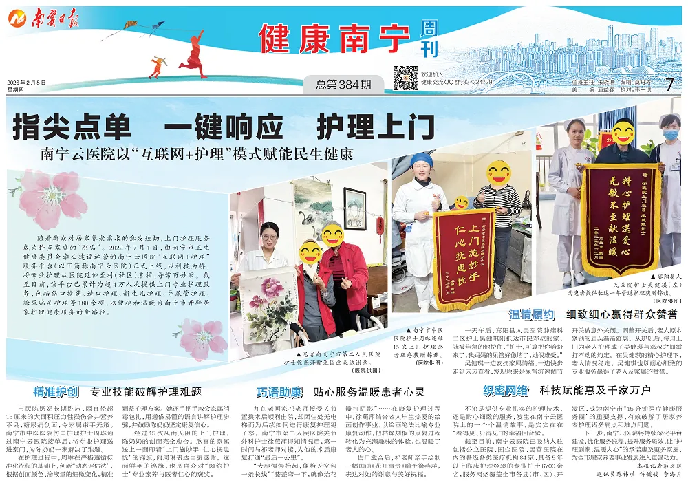 2月5日,《南宁日报》对由南宁市卫健委主导、熙康云医院承建并运营的全市统一“互联网+护理服务”平台——“南宁云医院居家护理”进行头条报道。以下是报道全文——