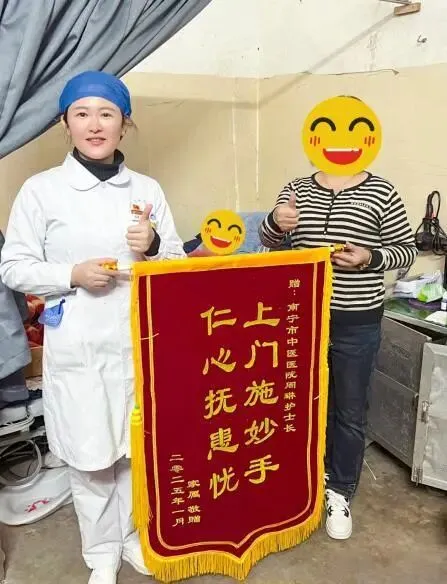 南宁市中医院护士周琳连续15次上门护理压疮患者获赠锦旗。(医院供图)