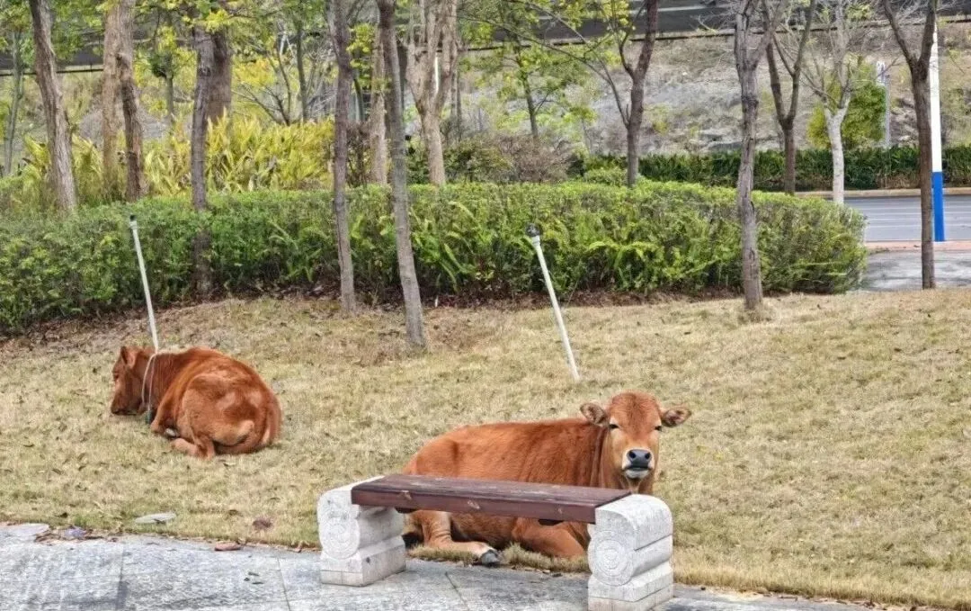 该所民警介绍,近期派出所接到报警,称滨江生态公园内来了两头牛,正在草地上悠闲吃草。民警赶到现场后发现,两头牛并未拴绳,正趴在草地上休息。民警在现场询问了多位市民,均未能找到牛的主人。无奈之下,民警联系了附近村屯的养牛村民,将这两头牛暂时安置在村民家中。此后几天,民警持续在周边村屯寻找牛主人,但一直没有线索。