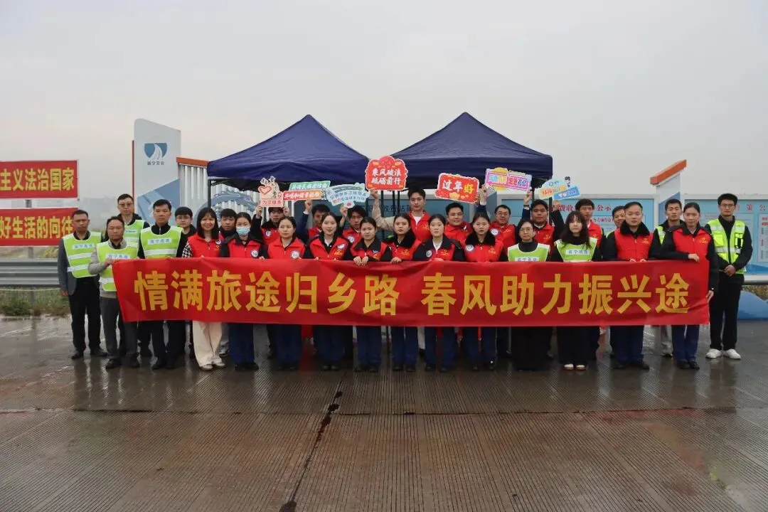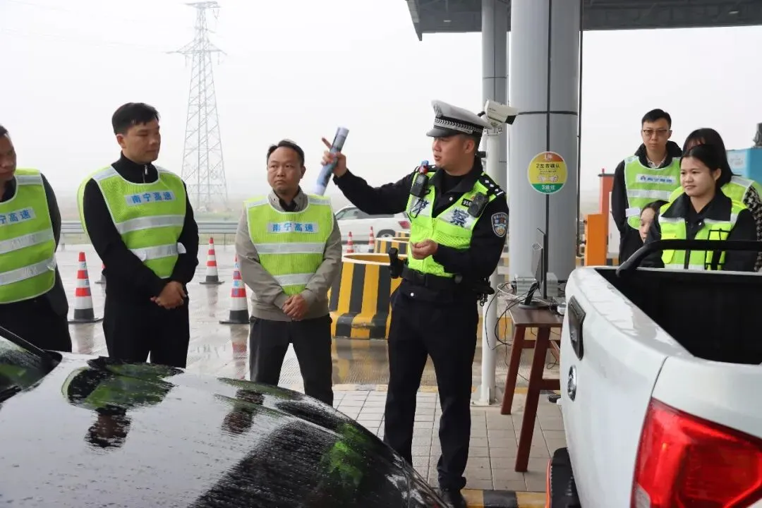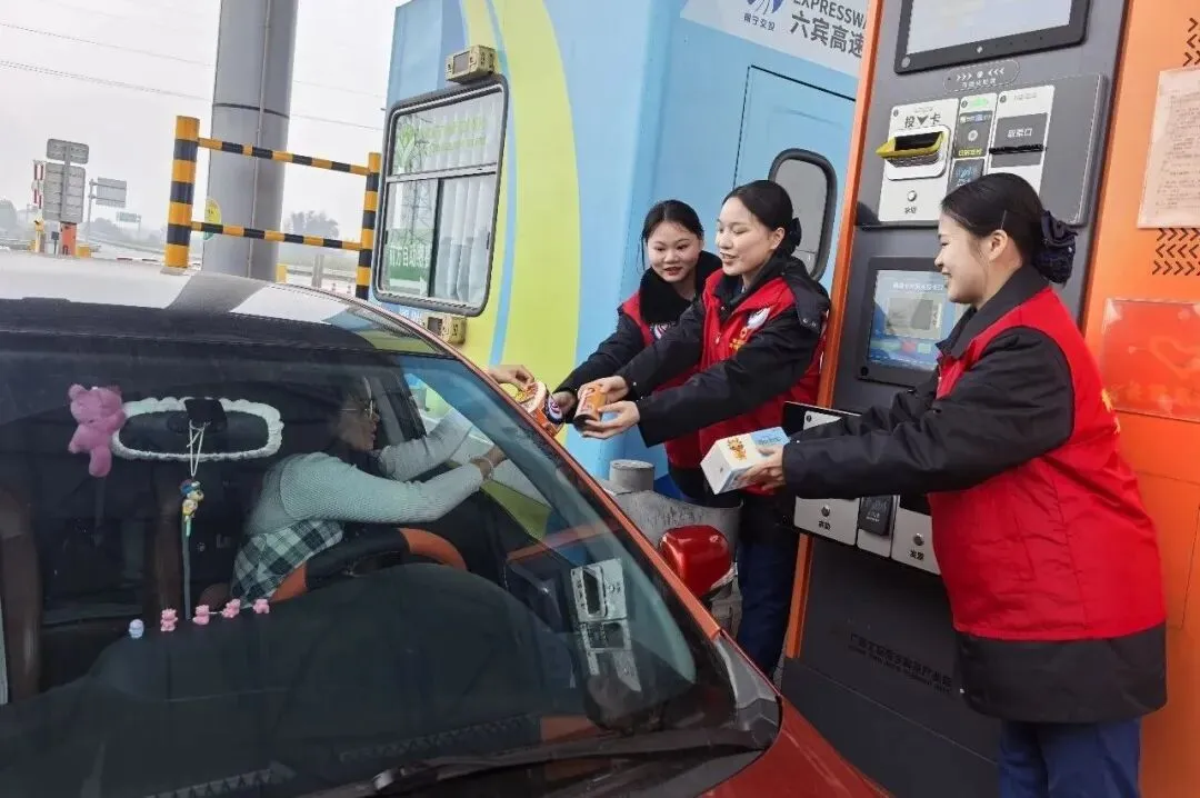 演练期间,宾阳县交通管理大队民警为员工开展现场业务指导与轻微事故快速处置培训,进一步强化了收费站应对突发事件的处理能力。演练结束后,“一路多方”单位还在宾阳南收费站外广场联合开展“情满旅途”志愿服务活动,通过设置暖心服务点,为司乘人员提供姜茶、食品、新春礼品及交通安全宣传,温暖司乘归途,获旅客点赞。