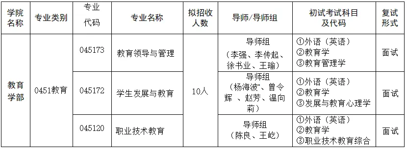 (1)复试形式:采用面试方式进行,重点考察考生的教育实践经验与实践能力、科研经历与科研能力、分析解决实际教育问题的能力、学术发展潜力及综合素质等。
