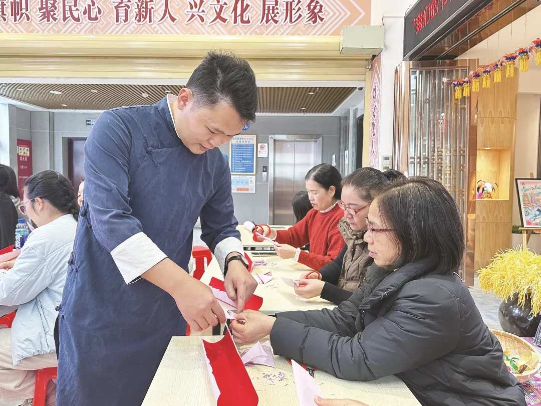 在实践环节,学员们在杨再旺的悉心指导下全神贯注地学习技巧。从基本折纸步骤到调整角度,再到勾勒轮廓、裁剪细节,杨再旺手把手指导,耐心解答疑问。不一会儿,一张张饱含心意的“团圆如意”窗花渐次“绽放”。“我不太会剪,还以为会很丑,没想到那么美,真是出乎我的意料。”市民李女士语气中满是惊喜。市民邓金华则对自己的作品非常满意:“新春跟非遗老师学剪纸,不仅学会了技法,懂得了纹样的美好寓意,更亲手触摸到了传统文化的温度,在动手创作里感受到了浓浓的年味和幸福感。”