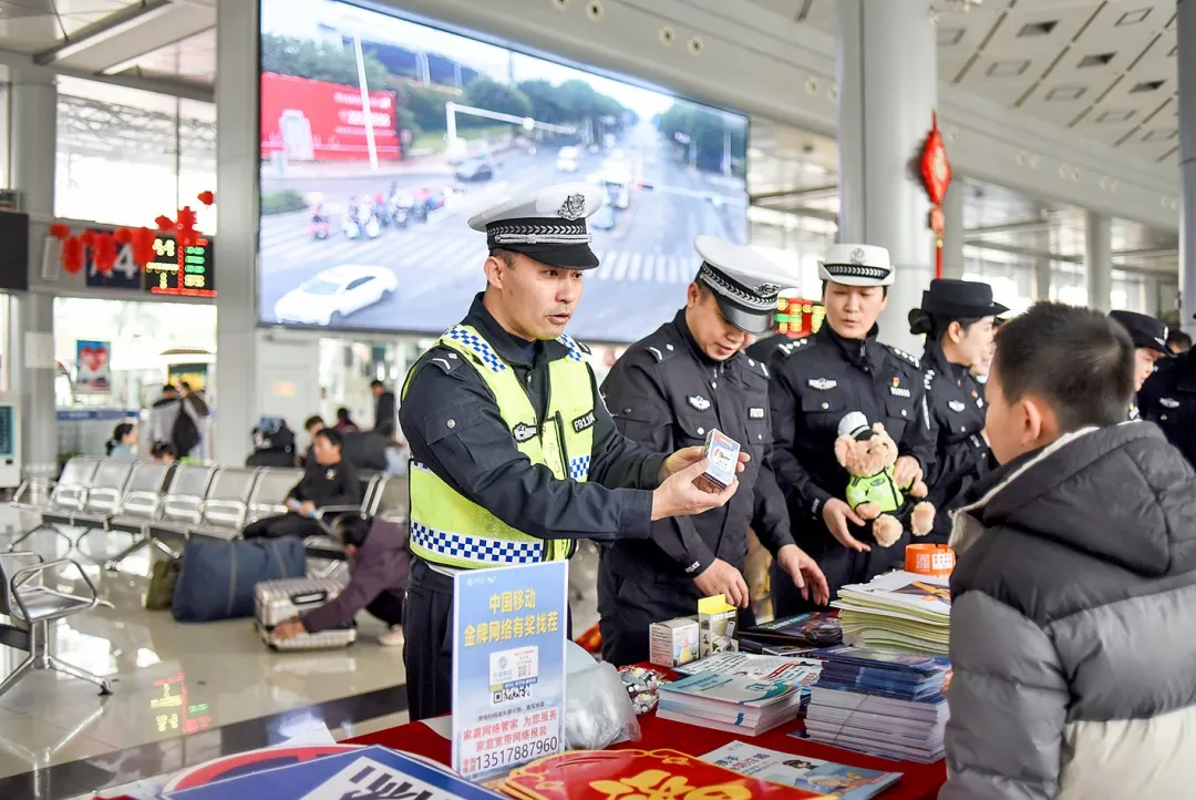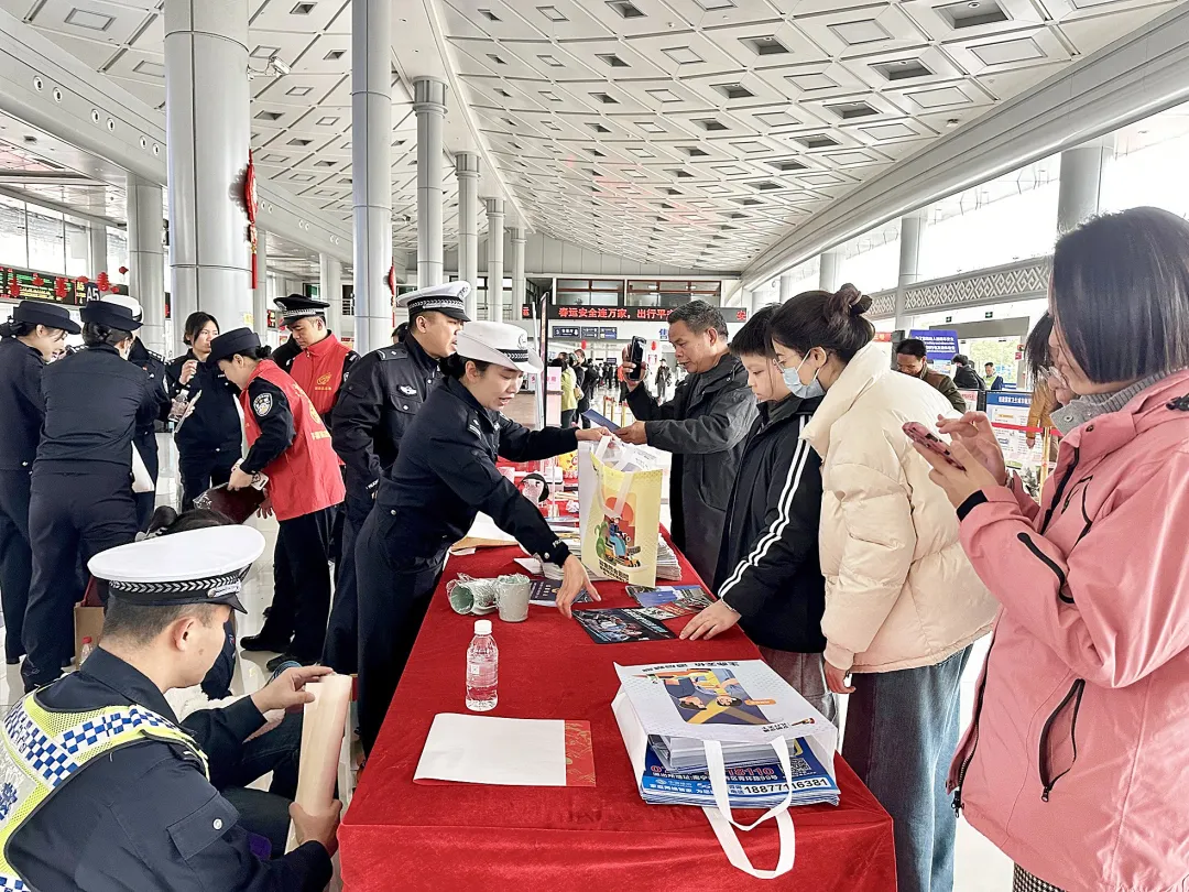 人来人往的汽车站里,旅客们的行囊中多了一份交警送的“安全礼”,心中多了一分对交通安全的敬畏。
