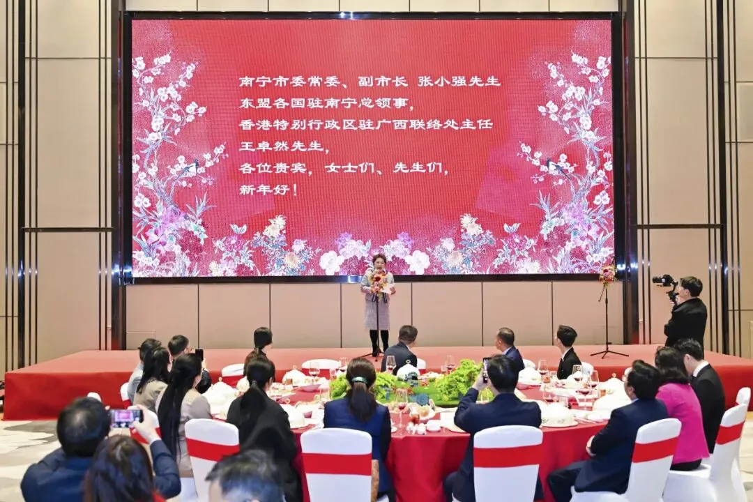 2月3日,南宁市人民政府举行“骏骥迎春 谊联四海”2026南宁市新春招待会,越南、柬埔寨、泰国、老挝、缅甸、马来西亚驻南宁总领事馆官员、香港特区政府驻广西联络处负责人以及自治区外事办、南宁市各部门代表等80余人欢聚一堂,畅叙友情,共谋发展,喜迎新春。市委常委、副市长张小强出席并致辞,市投促局作南A东盟谷推介。