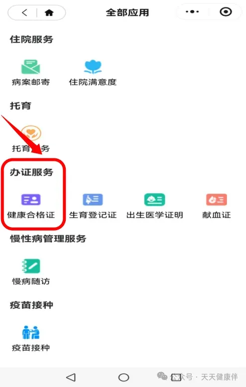 “办证服务”,点击“健康合格证”打开健康合格证页面。