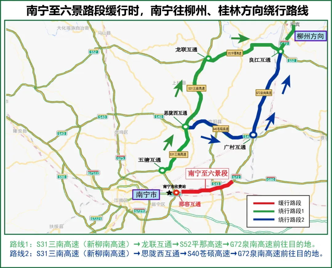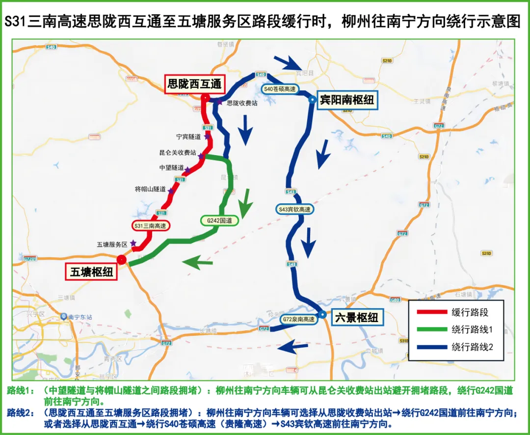 路线2:思陇西互通至五塘服务区路段拥堵时,柳州往南宁方向车辆可选择从思陇收费站出站→绕行G242国道往南宁方向;或者选择从思陇西立交→绕行S40苍硕高速(贵隆高速)→S43宾钦高速前往南宁方向。