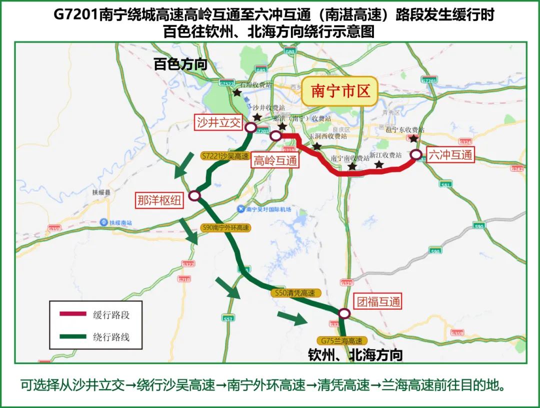 四、G7201南宁绕城高速高岭互通至六冲互通(南湛高速)路段发生拥堵时: