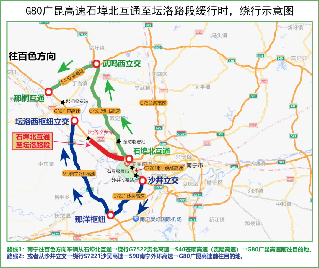 路线1:南宁往百色方向车辆从石埠北互通→绕行G7522贵北高速→S40苍硕高速(贵隆高速)→G80广昆高速前往目的地。