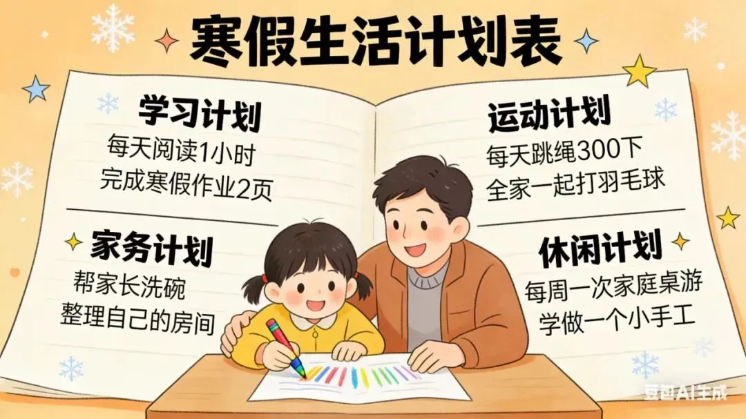 孩子和家长一起,用彩笔或贴纸制作一份专属寒假计划。