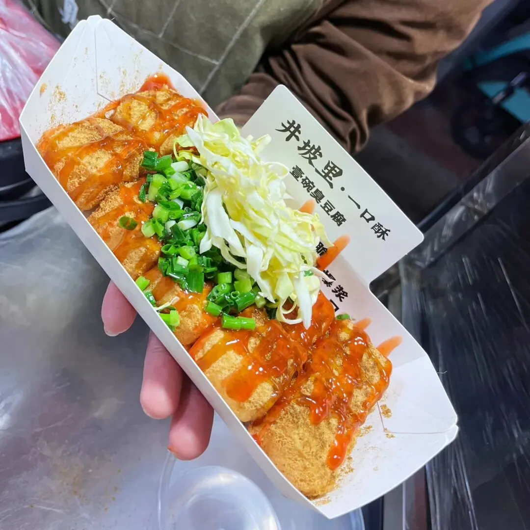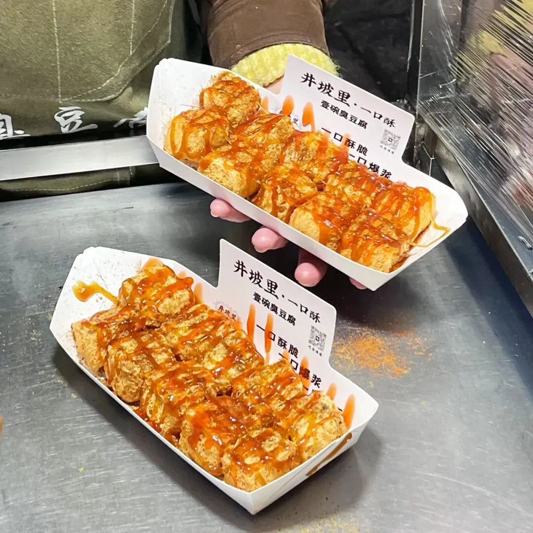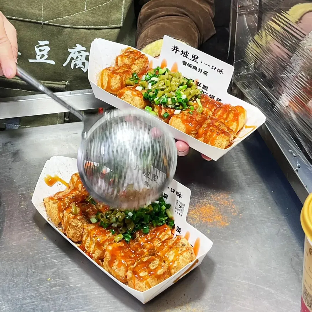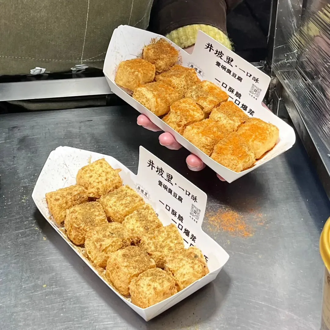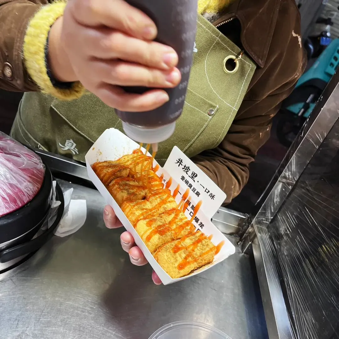 虽然说是臭豆腐,但是这种白色的一点都不臭,外酥里嫩,沾着番茄酱和孜然粉,一口下去,真的太好吃了。她们先将豆腐块炸得酥脆酥脆的,然后捞出控油,有些这一步掌控不好的话,味道就会差很多。把炸好的豆腐块整齐地摆放到盒子里,撒上孜然粉,加辣的话,就再撒上辣椒粉。然后挤上番茄酱,站在边上看着挤番茄酱,好解压。别人可以很均匀地挤在豆腐块上,如果换是我自己挤,估计会东一坨西一坨😂