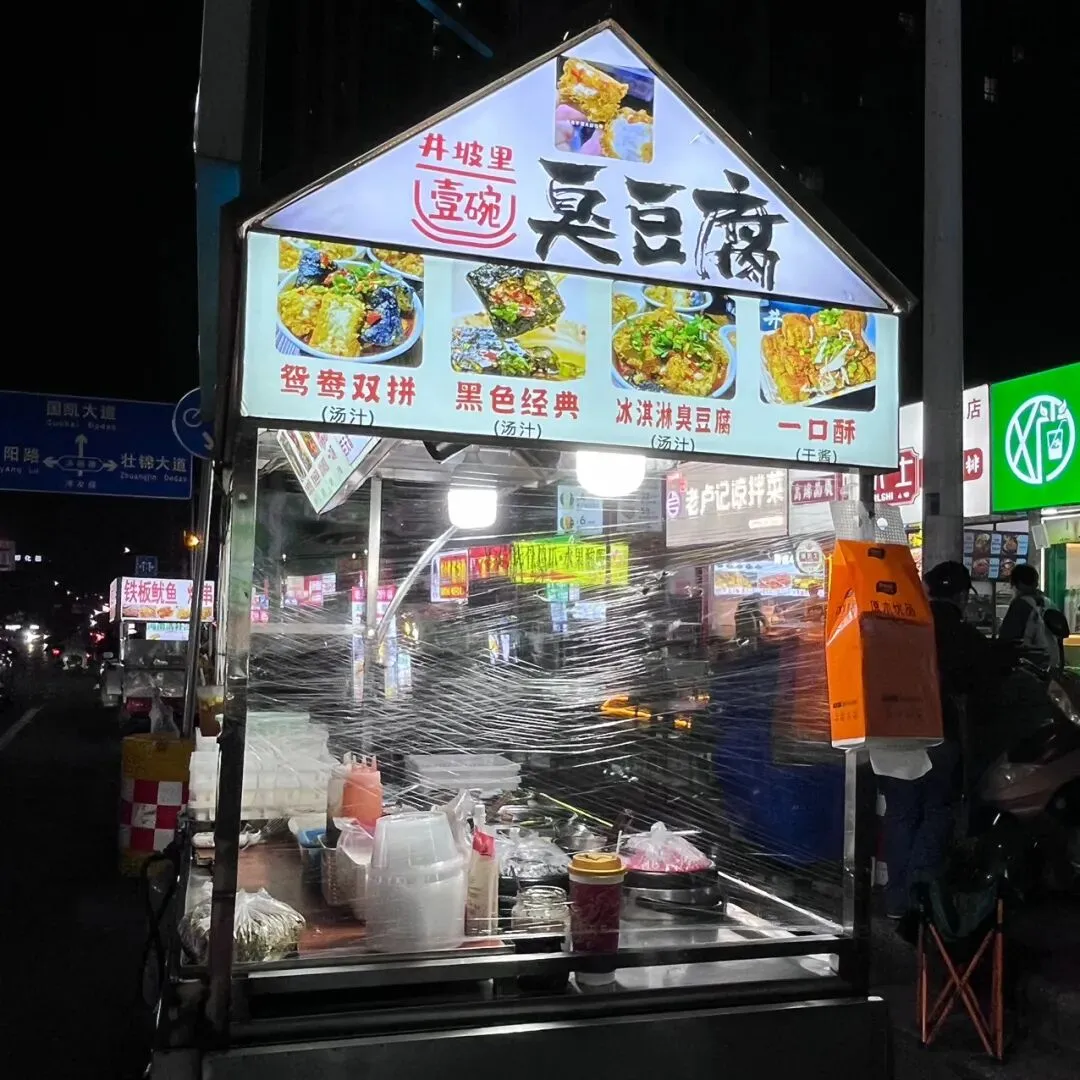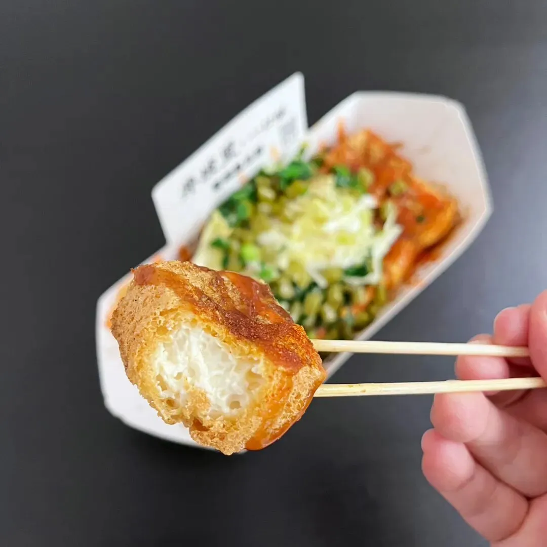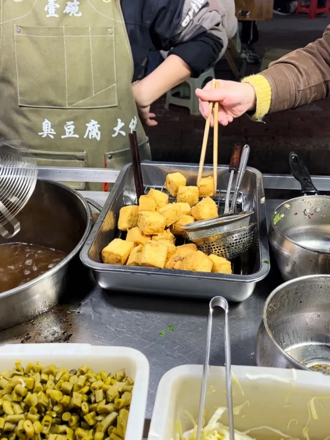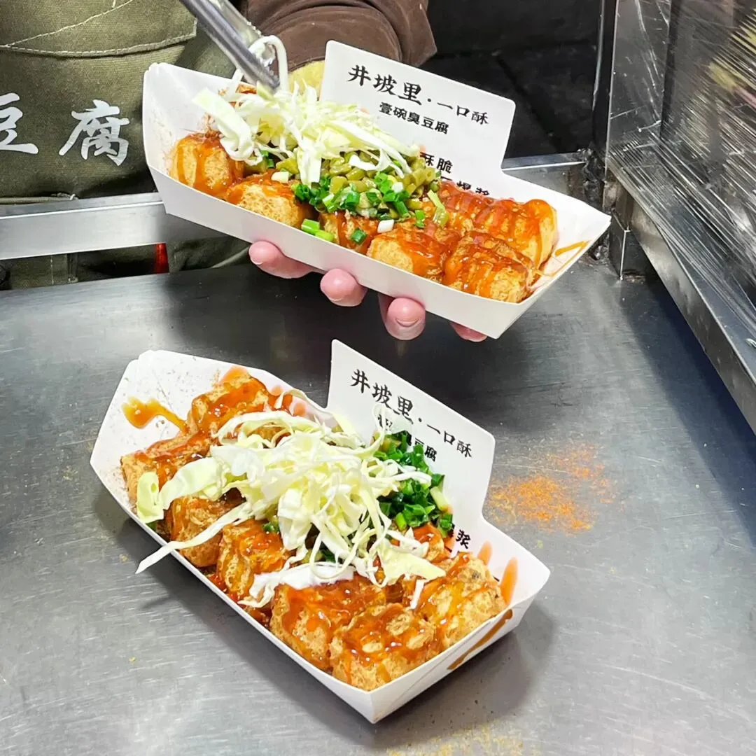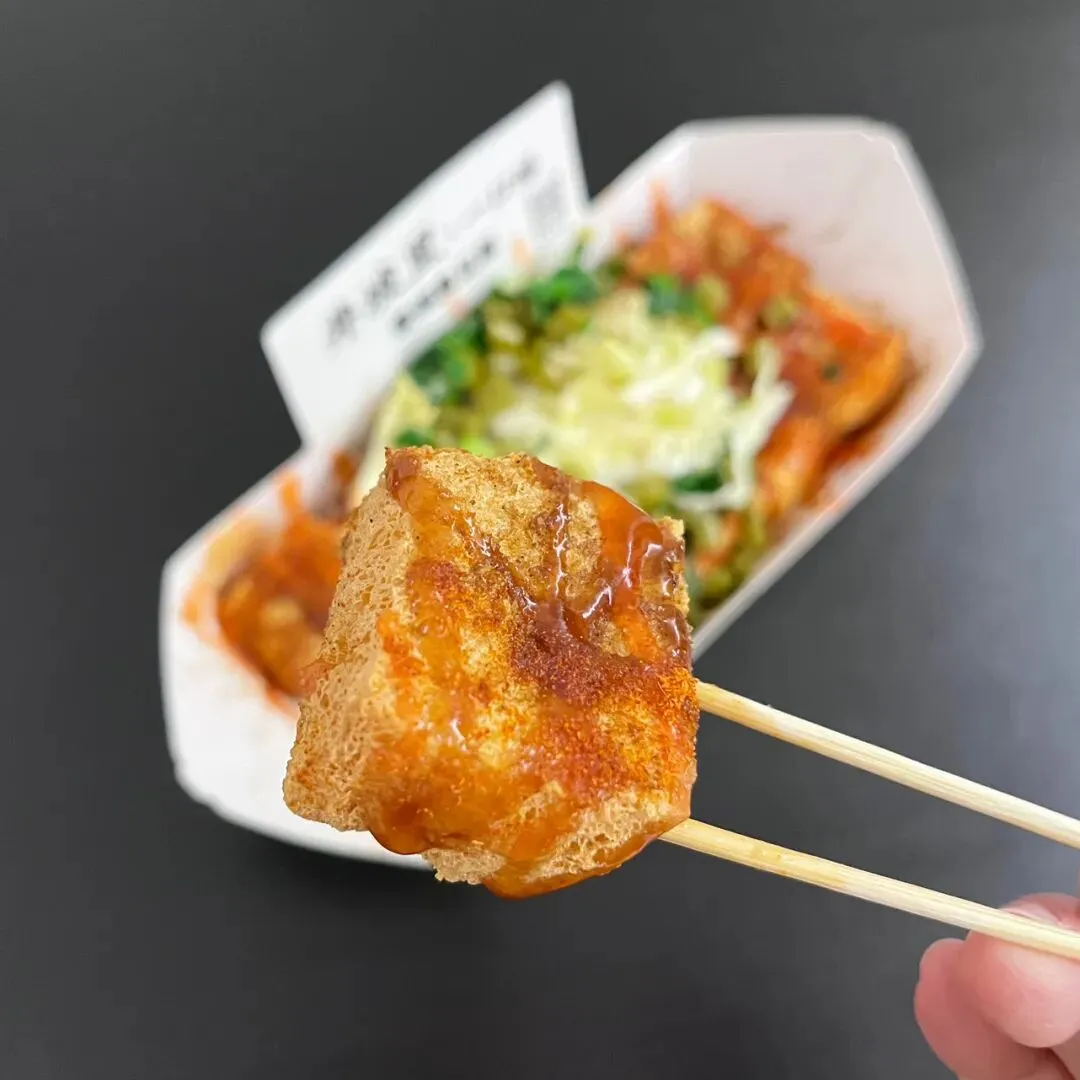 虽然说是臭豆腐,但是这种白色的一点都不臭,外酥里嫩,沾着番茄酱和孜然粉,一口下去,真的太好吃了。她们先将豆腐块炸得酥脆酥脆的,然后捞出控油,有些这一步掌控不好的话,味道就会差很多。把炸好的豆腐块整齐地摆放到盒子里,撒上孜然粉,加辣的话,就再撒上辣椒粉。然后挤上番茄酱,站在边上看着挤番茄酱,好解压。别人可以很均匀地挤在豆腐块上,如果换是我自己挤,估计会东一坨西一坨😂