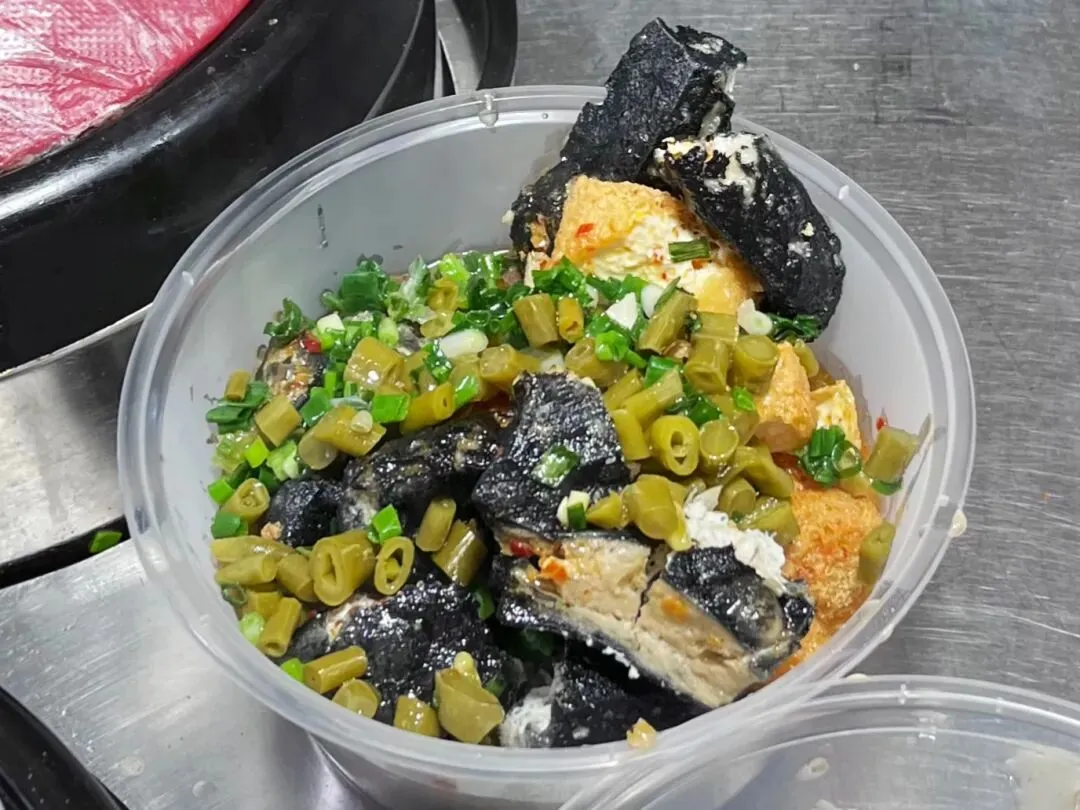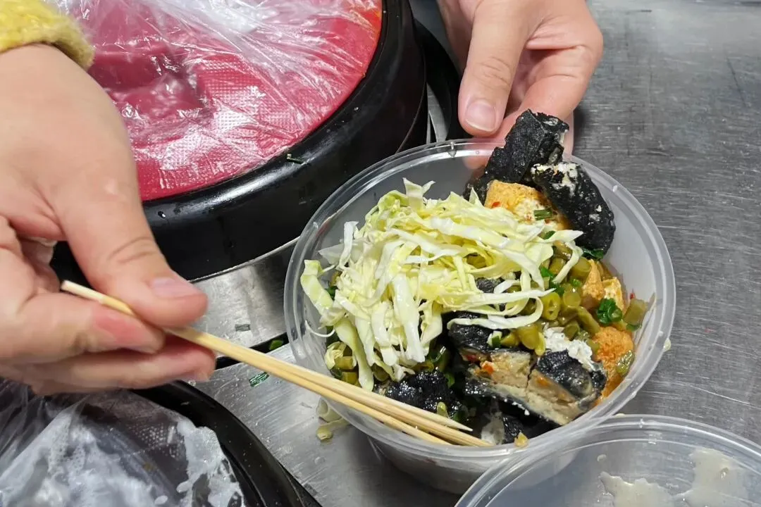 最后再放上酸包菜。她们家的酸豆角、酸包菜也很好吃,包菜看着生生的,但是却很入味,酸脆酸脆的很解腻。之前在其他地方吃过的,是只放热油烫过的葱花,没有放酸豆角和酸包菜这些。本来还担心酸豆角和酸包菜会影响到炸豆腐的口感,后面发现多虑了,酸豆角和酸包菜中和掉炸豆腐的油腻,吃到后面,越吃越好吃。她们家的豆腐有黑色和白色两种,一口酥是干酱,冰淇淋臭豆腐是有放汤汁的,我原本还以为冰淇淋臭豆腐是另外一个品种的豆腐,还挺好奇冰淇淋豆腐是什么样的。问了老板,老板说豆腐都一样,就是干酱和汤汁的区别。