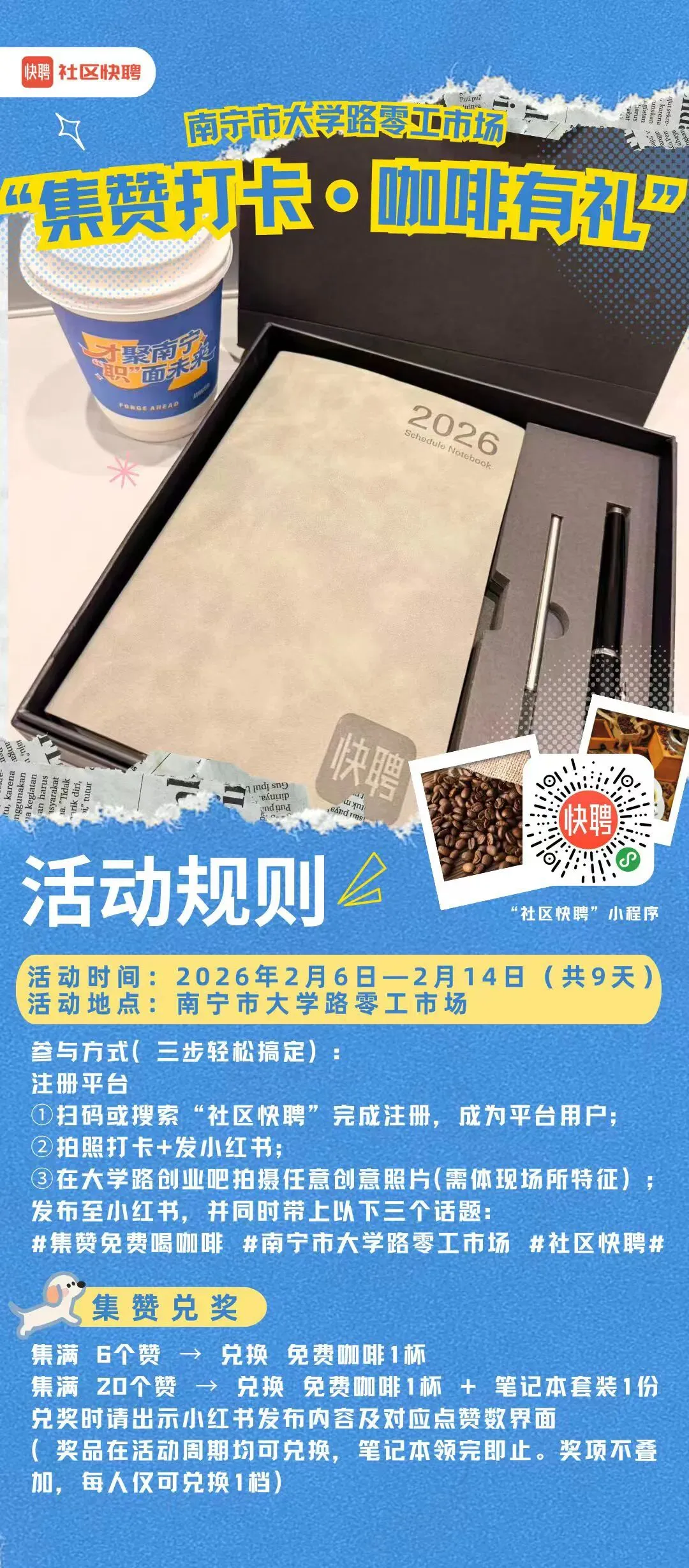 2026年2月6日-14日,注册“社区快聘”平台,在大学路就业创业吧拍创意照、发小红书带话题,集赞就能换免费咖啡!