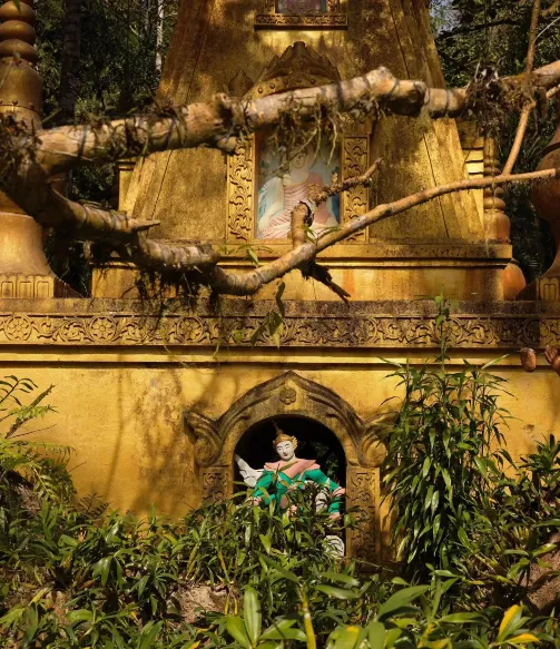位于孔雀湖畔雷牙让山顶的勐焕大金塔是芒市地标性建筑,它是中国第一金佛塔和亚洲第一空心佛塔,傣族人民的圣地。