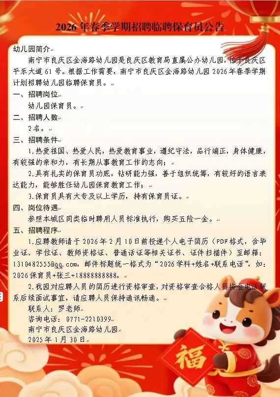 南宁市兴宁区天德路幼儿园为南宁市兴宁区教育局管理的公办幼儿园,实行全额拨款经费管理,由城区财政核拨。幼儿园位于南宁市兴宁区天德路13号。根据南宁市兴宁区天德路幼儿园发展需要,现面向社会公开招聘顶岗教师、保育员。具体招聘事宜如下:
