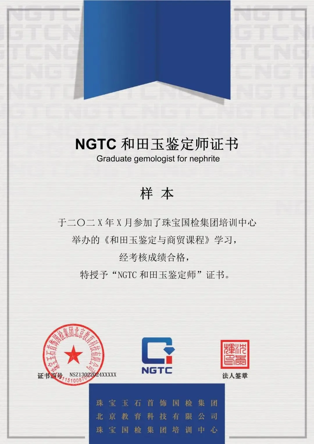 考核成绩合格者可获得由珠宝国检集团培训中心颁发的“NGTC和田玉鉴定师证书”。