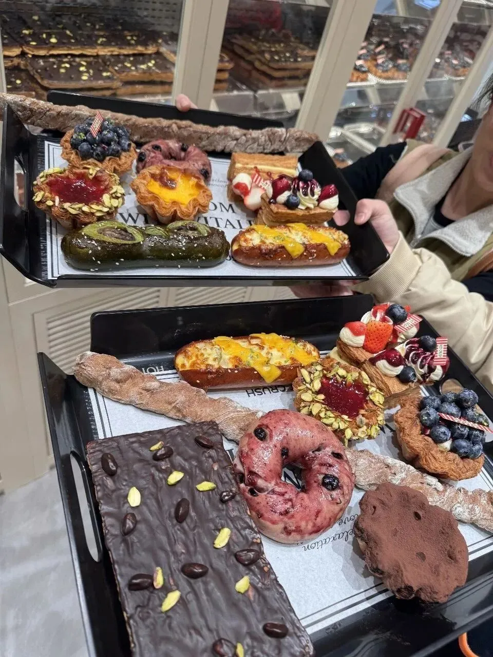 很多人排队的新面包店,种类丰富,甜品控路过就想带几个回家。