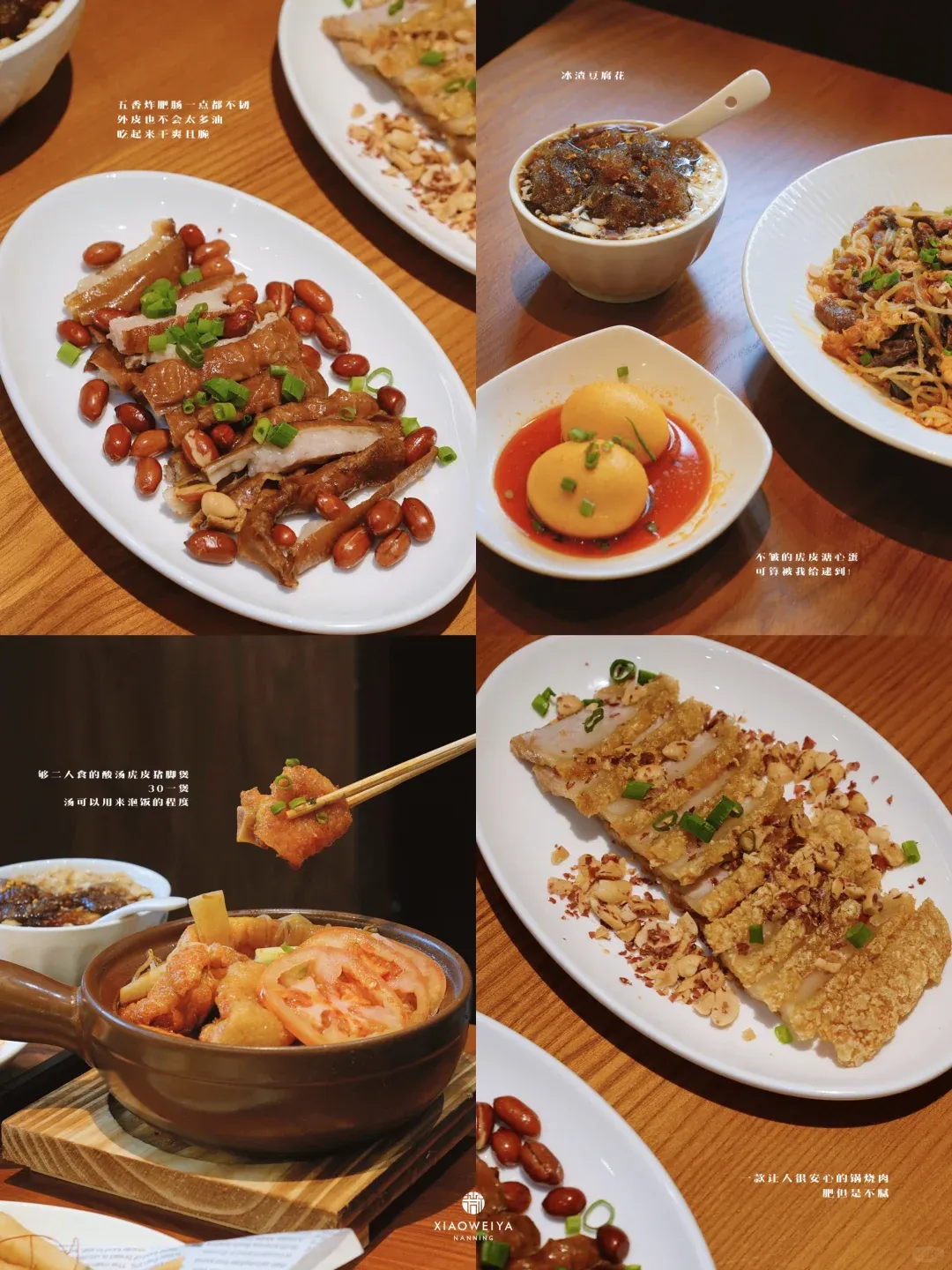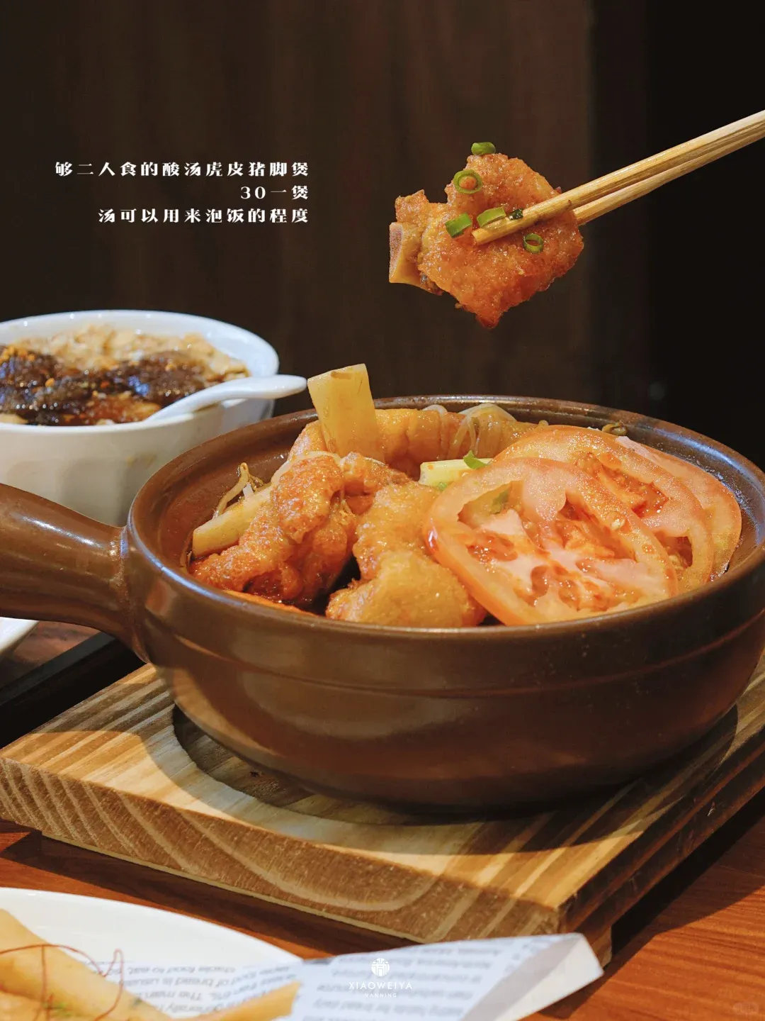 五香炸肥肠干爽且脆,虎皮溏心蛋等小菜表现出色,二人食可以点一煲酸汤虎皮猪脚煲,热乎乎的。