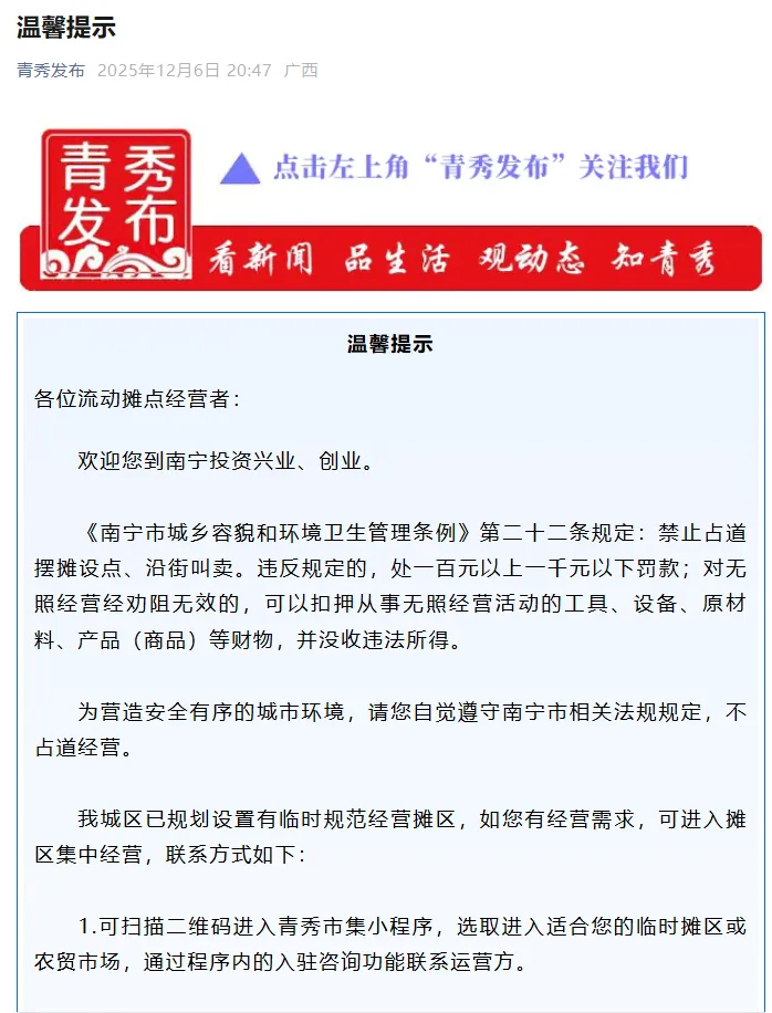12月6日,青秀区、兴宁区、江南区、良庆区发布温馨提示: