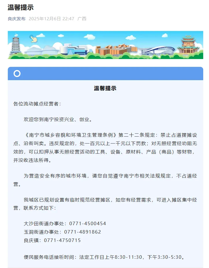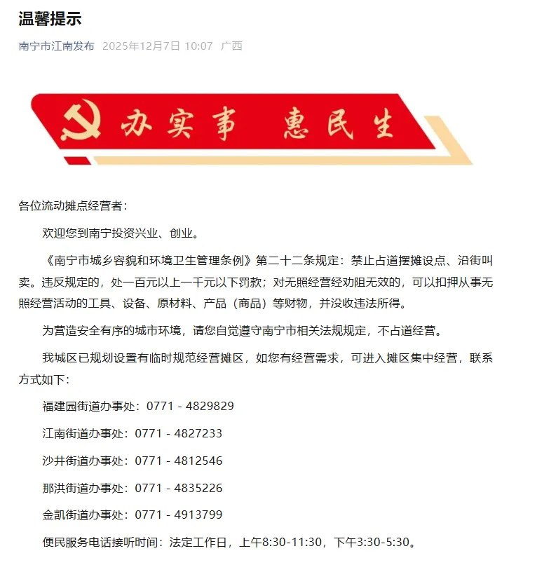 为营造安全有序的城市环境,请您自觉遵守南宁市相关法规规定,不占道经营。