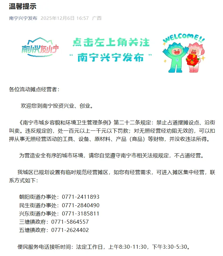 欢迎各位流动摊点经营者到南宁投资兴业、创业。