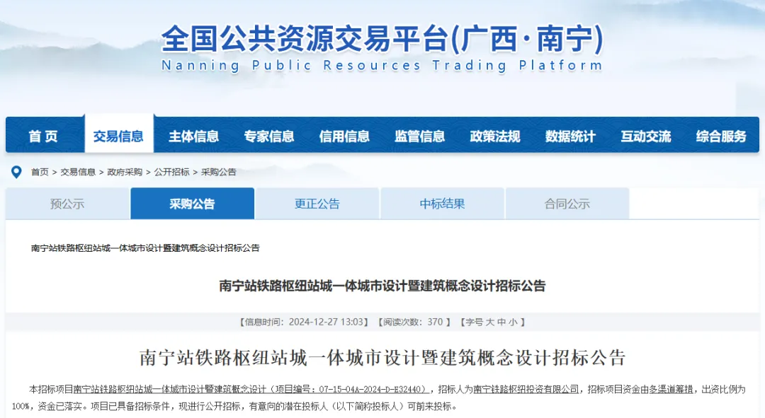 最终,在2025年1月24日,该项目发布中标结果公告,中标人为:南宁市建筑规划设计集团有限公司、中铁二院工程集团有限责任公司、株式会社日建设计、戴德梁行房地产顾问(深圳)有限公司联合体。