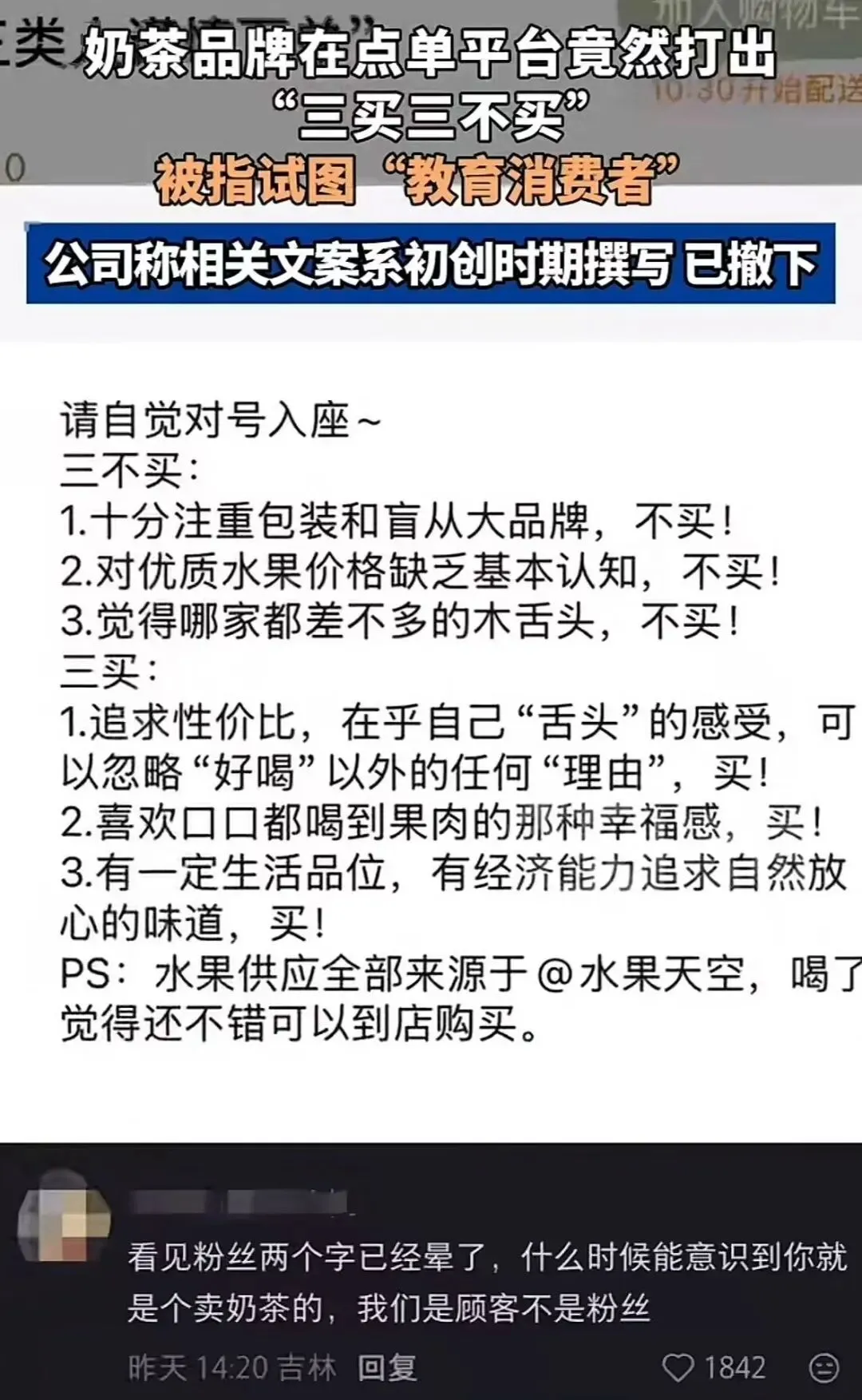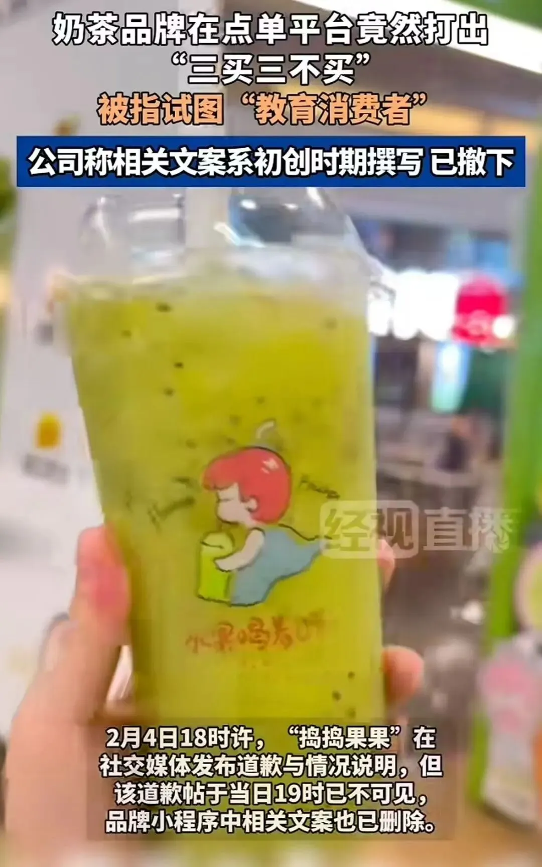 2026 年 2 月初,广西南宁奶茶品牌 “捣捣果果” 因在官方小程序推出 “三买三不买” 的顾客分类规则,陷入全网舆论漩涡。