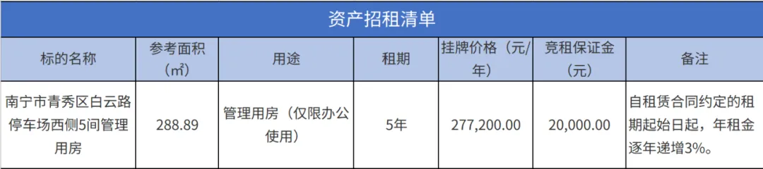 本次招租标的为南宁市青秀区白云路停车场西侧5间管理用房,参考面积为288.89㎡,由南宁交通投资集团有限责任公司委托出租方经营管理。标的基本情况详见资产招租清单。
