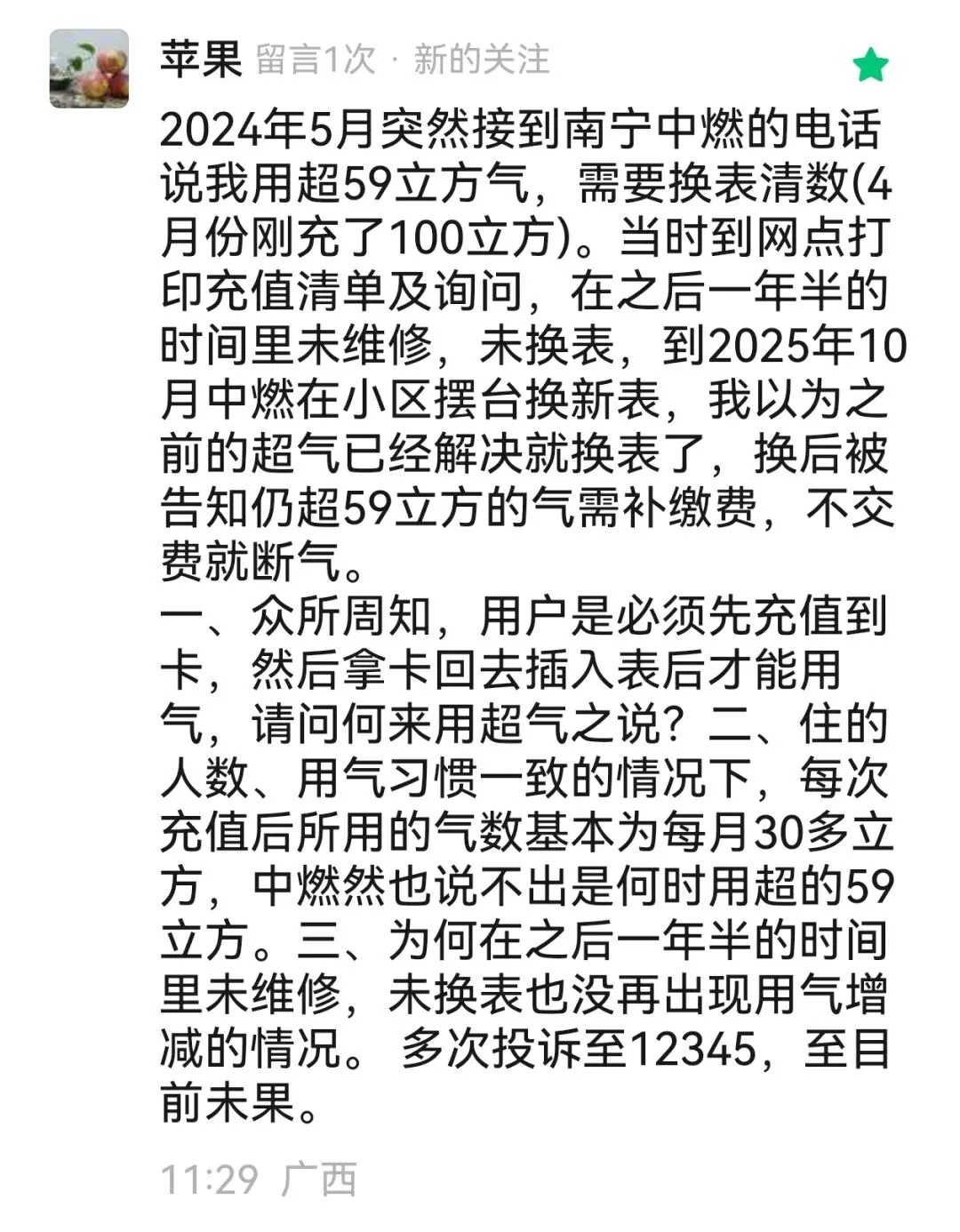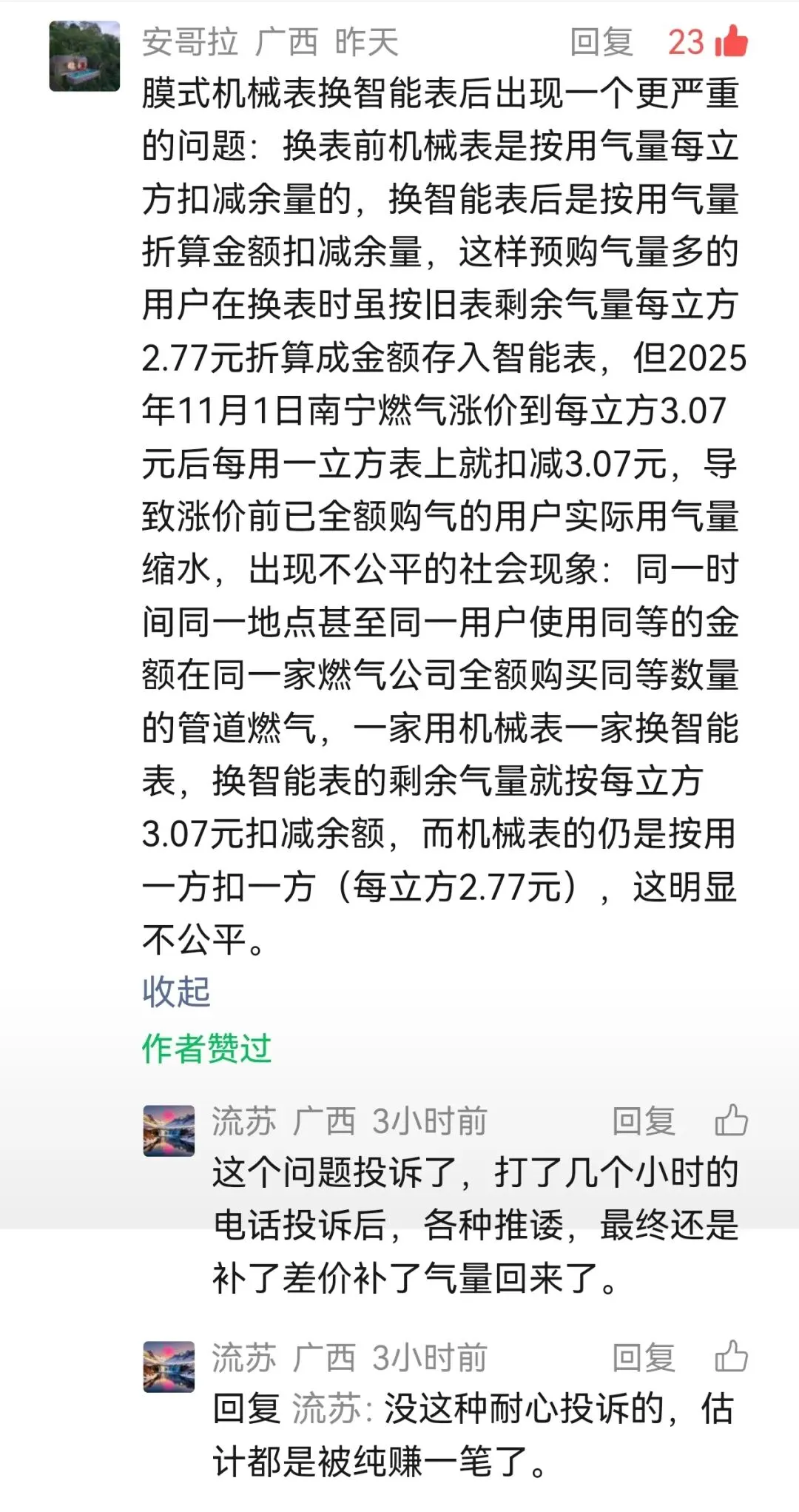 三、万千用户诉求明确,汹涌的民意燃气公司请勿漠视梳理市民诉求,核心主张清晰且合法:立即停止将存量气量折算为金额的违规操作,将智能表内余额按原购气价2.77元/立方米,折算回剩余气量,恢复按量扣减;对已按新价多扣减的气量/费用,全额退还、补足气量;公开道歉,修正智能表计费系统,提供“按量计费”与“按额计费”的自主选择权;接受市场监管、价格、发改部门的监督检查,纠正所有违法违约条款。对比全国多地做法,南宁燃气的操作堪称另类:三明、威海、重庆等城市均明确,预付费表用户已购买的存量气量,价格上调后不追溯、不折算、依旧按原气量使用,这是合规通行做法。而南宁燃气无视行业惯例、无视法律规定、无视市民呼声,面对舆论监督与群众投诉,仅以“系统设置”“公司规定”搪塞,无任何整改动作,尽显垄断企业的傲慢。燃气是基本民生刚需,燃气企业手握区域垄断经营权,肩负公共服务职责,而非逐利商人。智能表升级的初衷,是降低抄表成本、提升服务效率,而非借机设置计费陷阱、侵害用户权益。从网友当前反馈内容看,南宁燃气涉嫌将“便民工程”异化为“侵权工具”,用技术升级掩盖规则不公,用单方强制取代平等协商,用企业规章对抗国家法律,不仅违反相关法律规定,更严重伤害市民情感,透支政府公信力。汹涌的民意,不是无理取闹,而是守护合法财产的正当诉求;合法的维权,不是对抗企业,而是督促企业守法律、讲公平、尽责任。我们呼吁南宁市市场监管局、发展改革委迅速介入立案调查,守护民生底线,维护法律尊严。