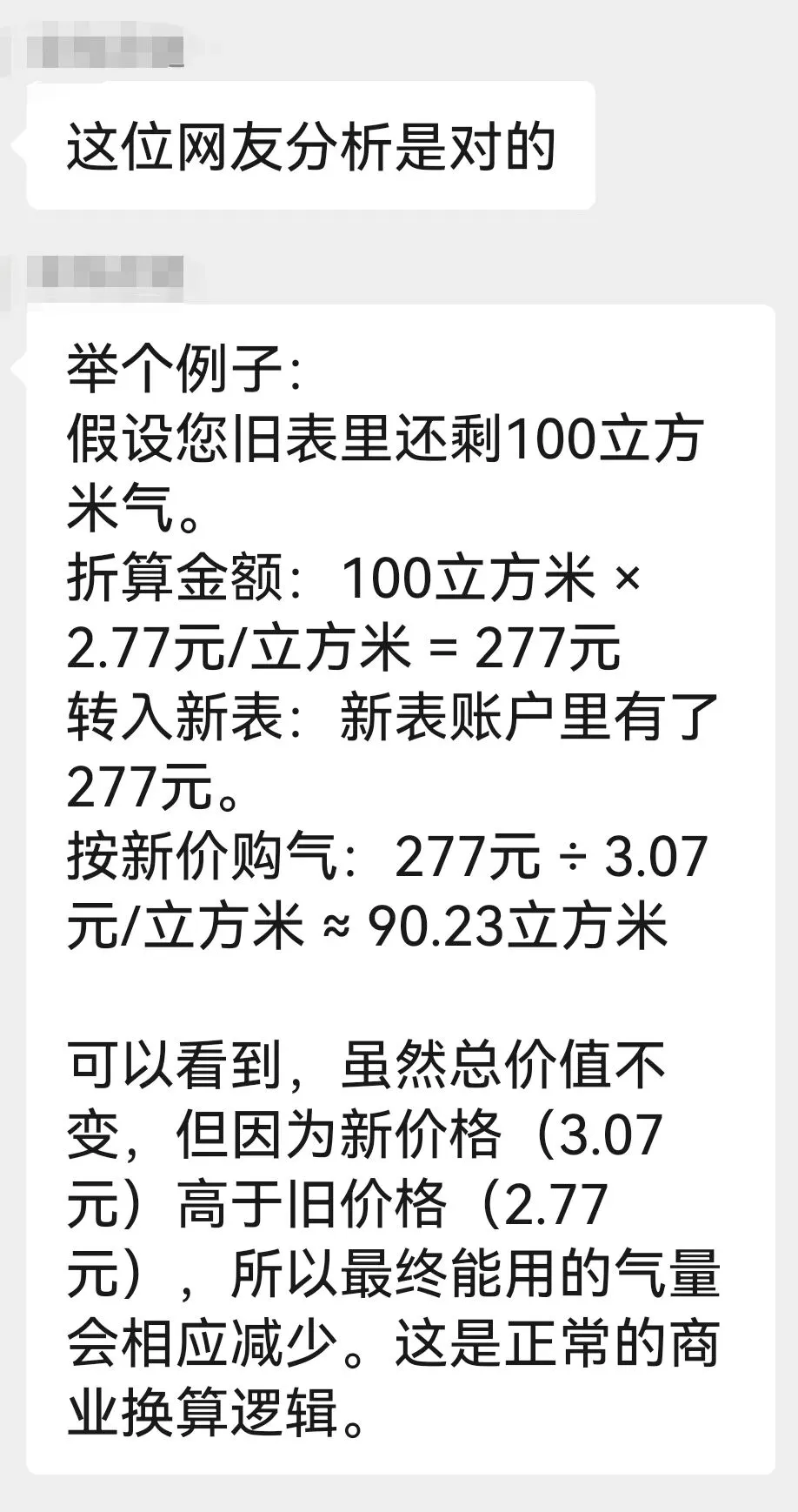 这一转换,直接造成用户权益受损:以旧表剩余100立方米气量为例,换表前价值277元,可足额使用100方;换表后折算为277元余额,按3.07元/方扣费,仅能使用约90.2方,凭空减少近10方气量。囤气越多、剩余气量越大的用户,亏损越严重。这种操作到底是部分市民偶然的遭遇还是燃气公司的普遍性行为目前不得而知。