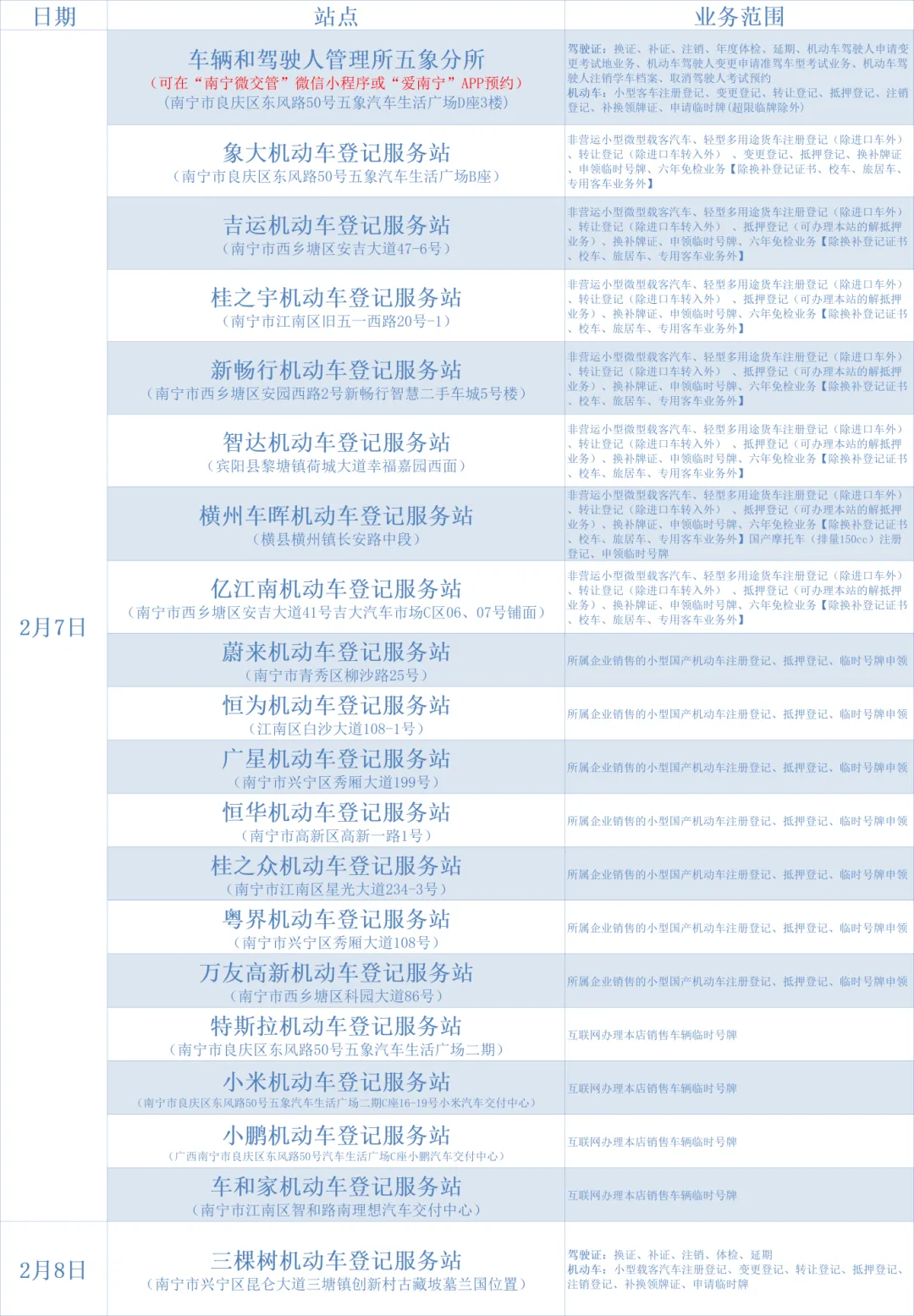 为切实方便群众,南宁交警持续深化便民服务措施,周末开设交管服务窗口办理相关业务。业务办理时间上午:10:00-12:00 下午:13:00-16:00 其中五象分所业务办理时间: 上午:9:00-12:00 下午:13:00-17:00