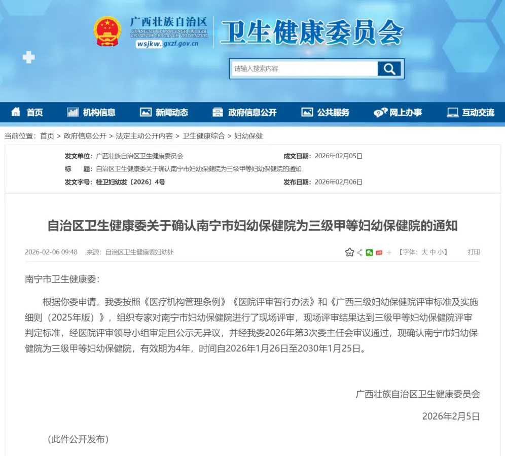2026年2月5日,广西壮族自治区卫生健康委员会正式发文,确认南宁市妇幼保健院为三级甲等妇幼保健院,有效期自2026年1月26日至2030年1月25日。这一荣誉的取得,是对医院七十余载深耕妇幼健康领域的高度认可。