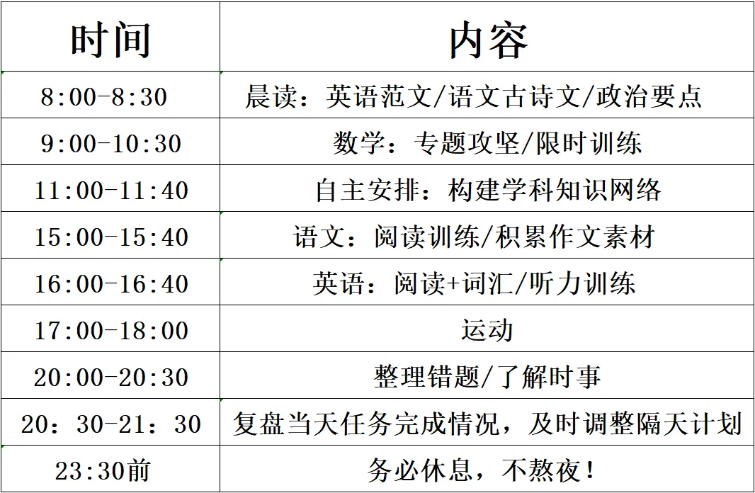 (3)书写与表达:每日坚持15分钟英语练字,保证书写工整清晰。每周积累1篇高考范文,如书信、演讲稿、读后续写等,整理不同文体的万能开头、结尾与过渡句型,形成自己的“独家模板”。