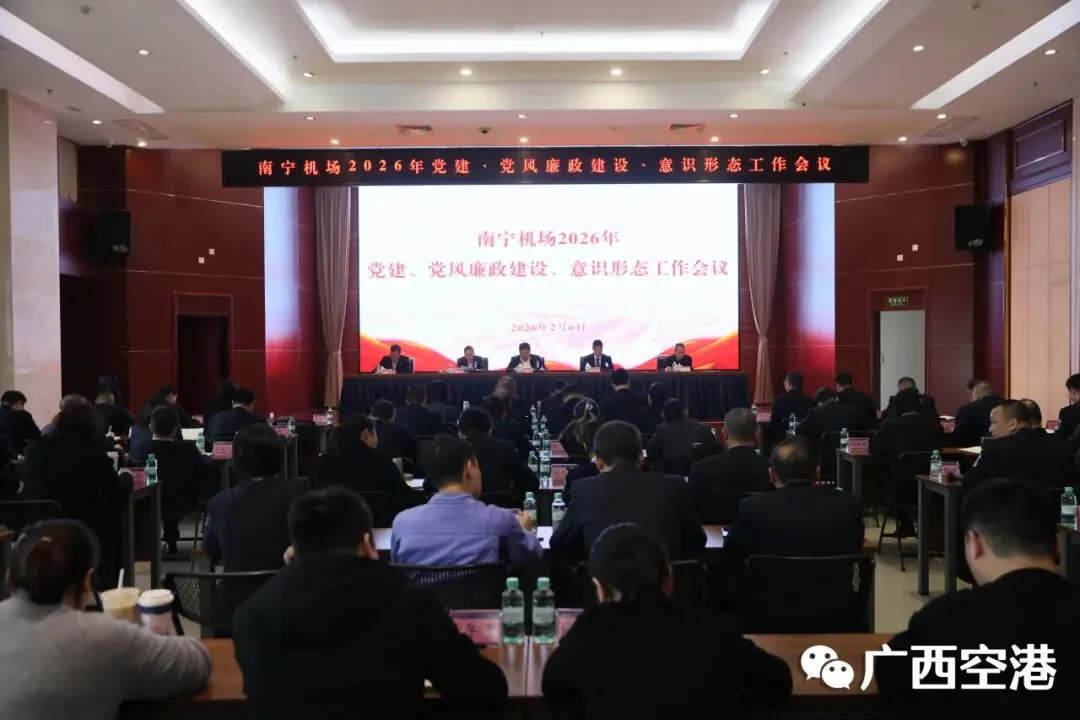 2月6日,南宁机场召开2026年党建、党风廉政建设、意识形态工作会议。南宁机场党委书记、董事长罗浩出席会议并讲话。会议由南宁机场党委副书记、副董事长、总经理祁振兴主持。
