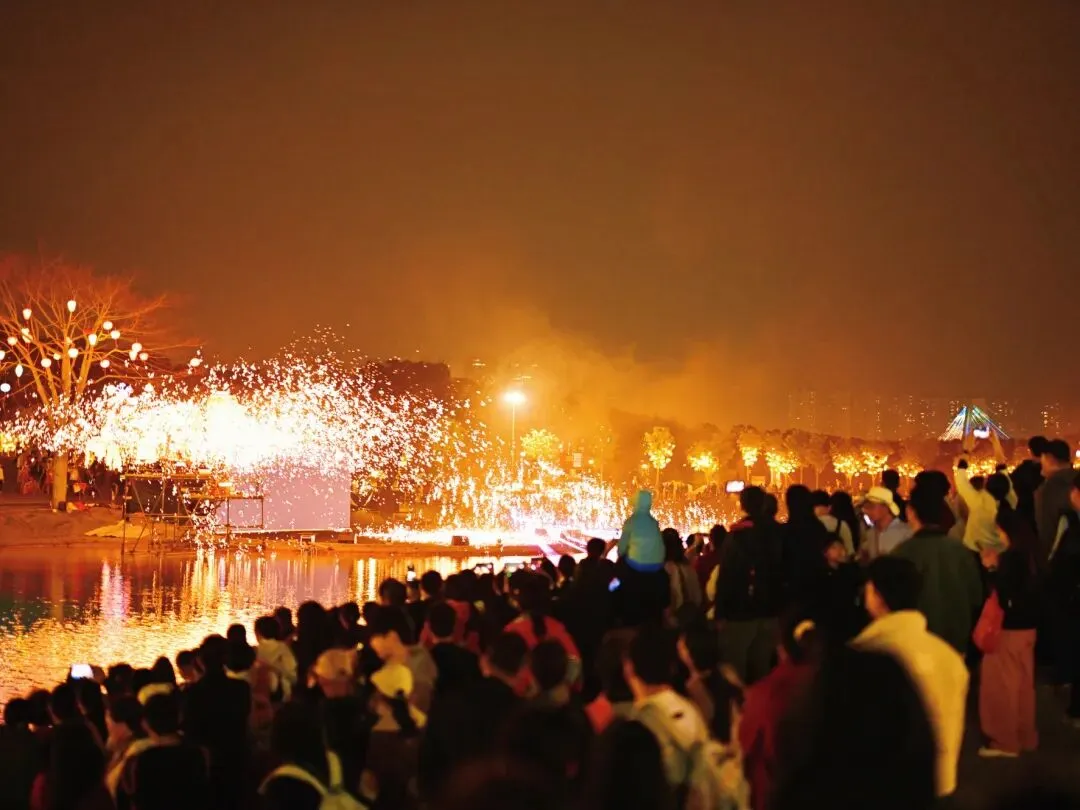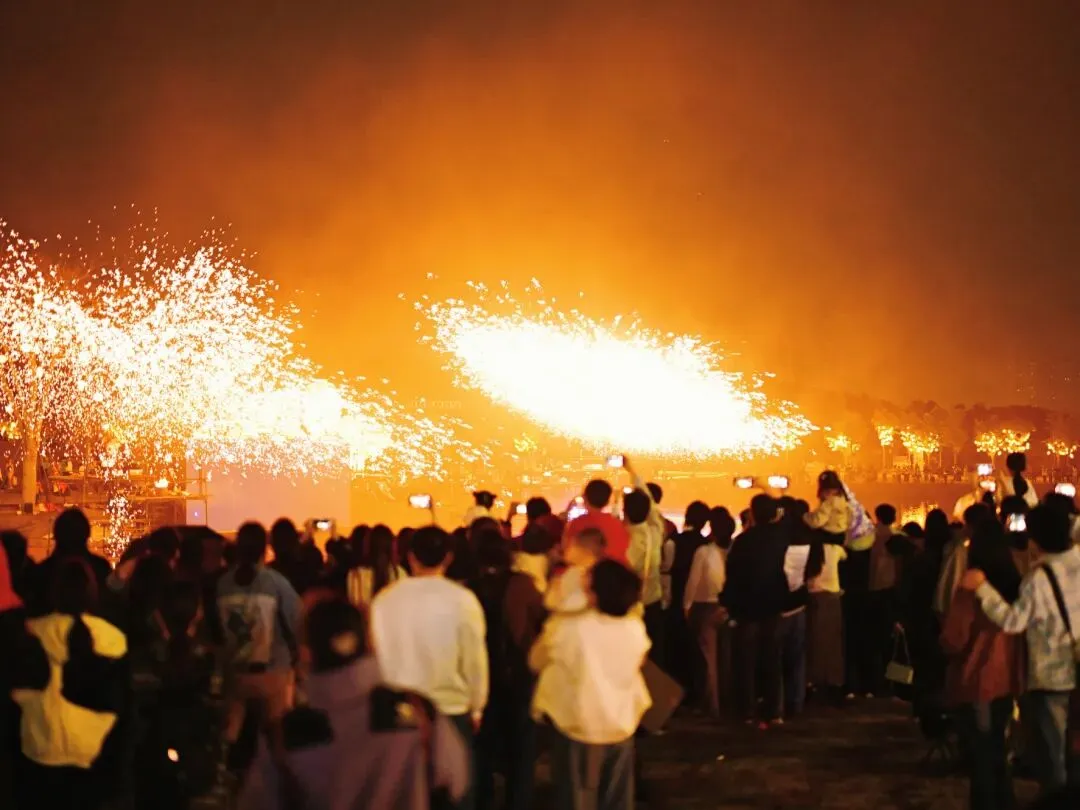 国家级非遗“打铁花”璀璨绽放,结合飞天舞狮、水上火艺秀,呈现一场惊心动魄的火光盛宴。